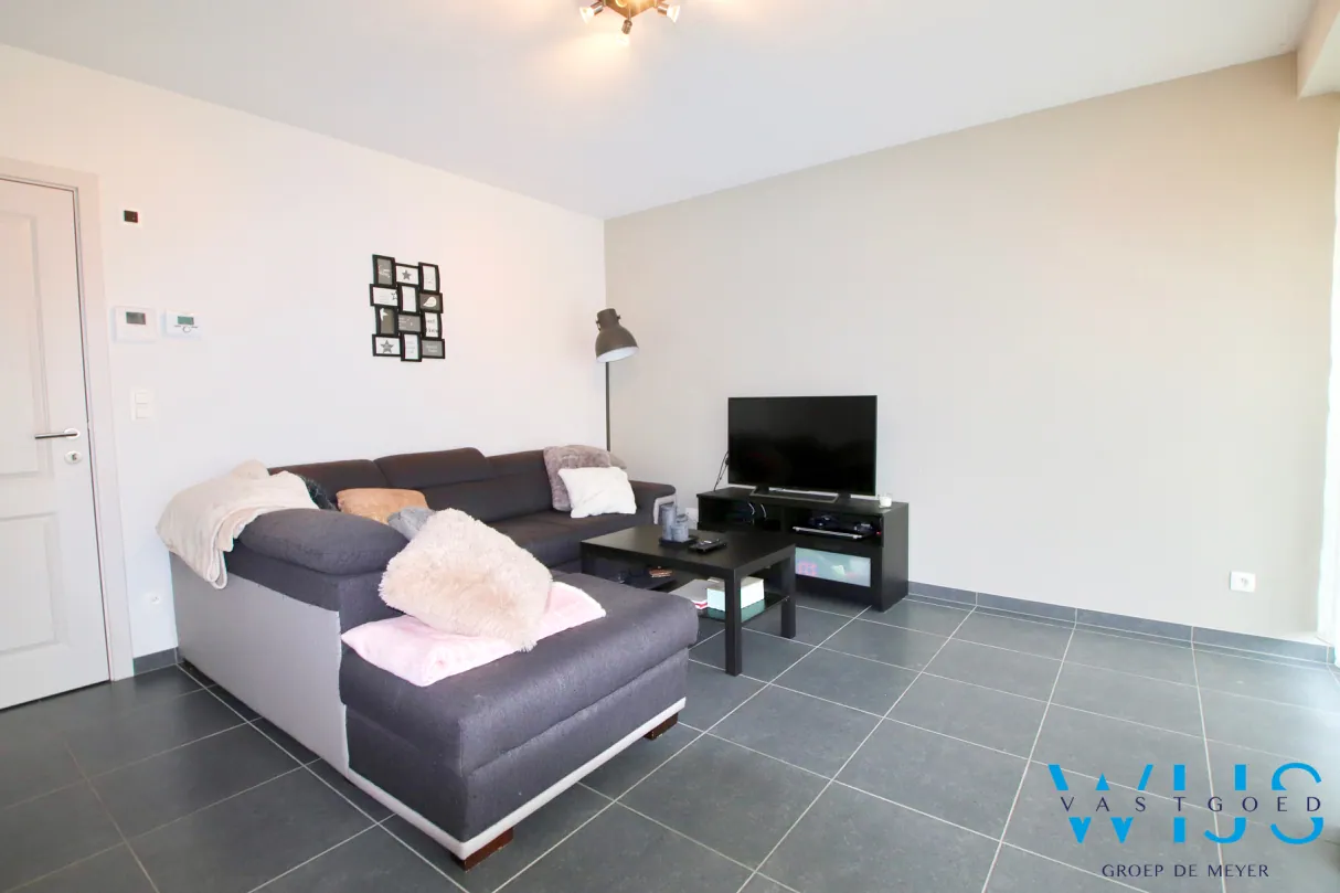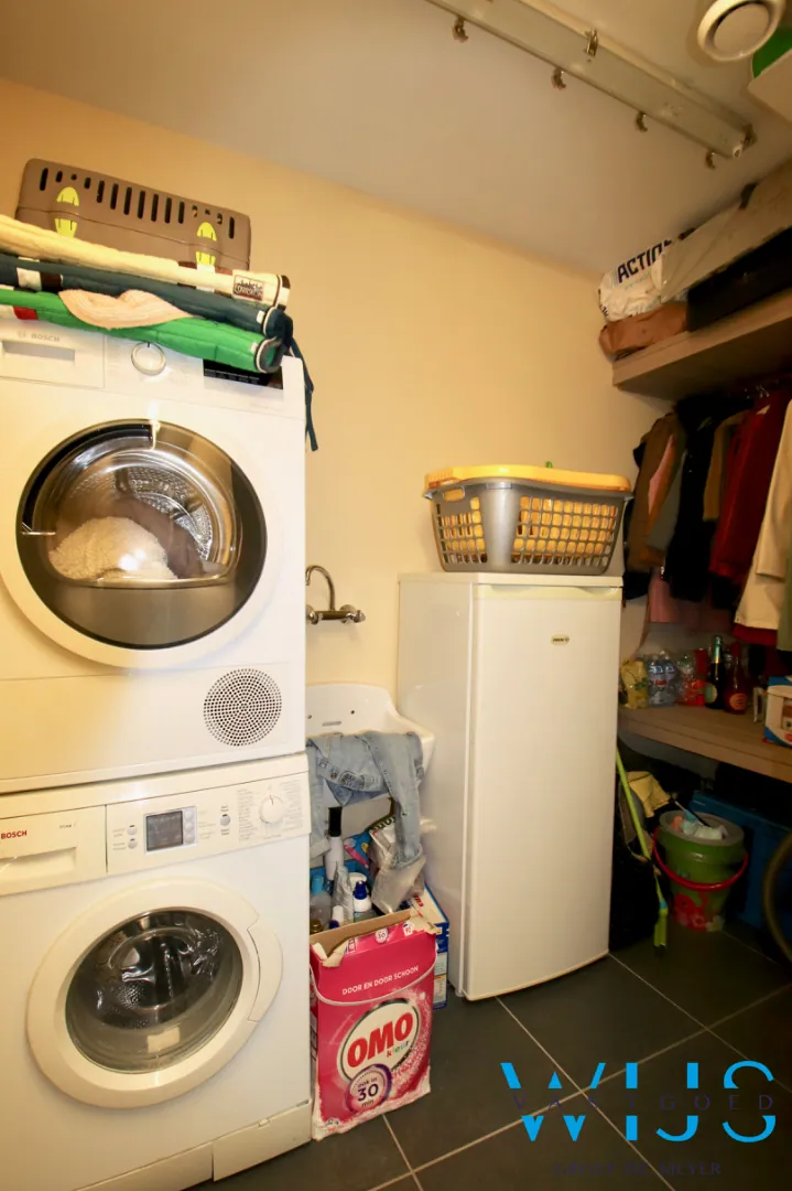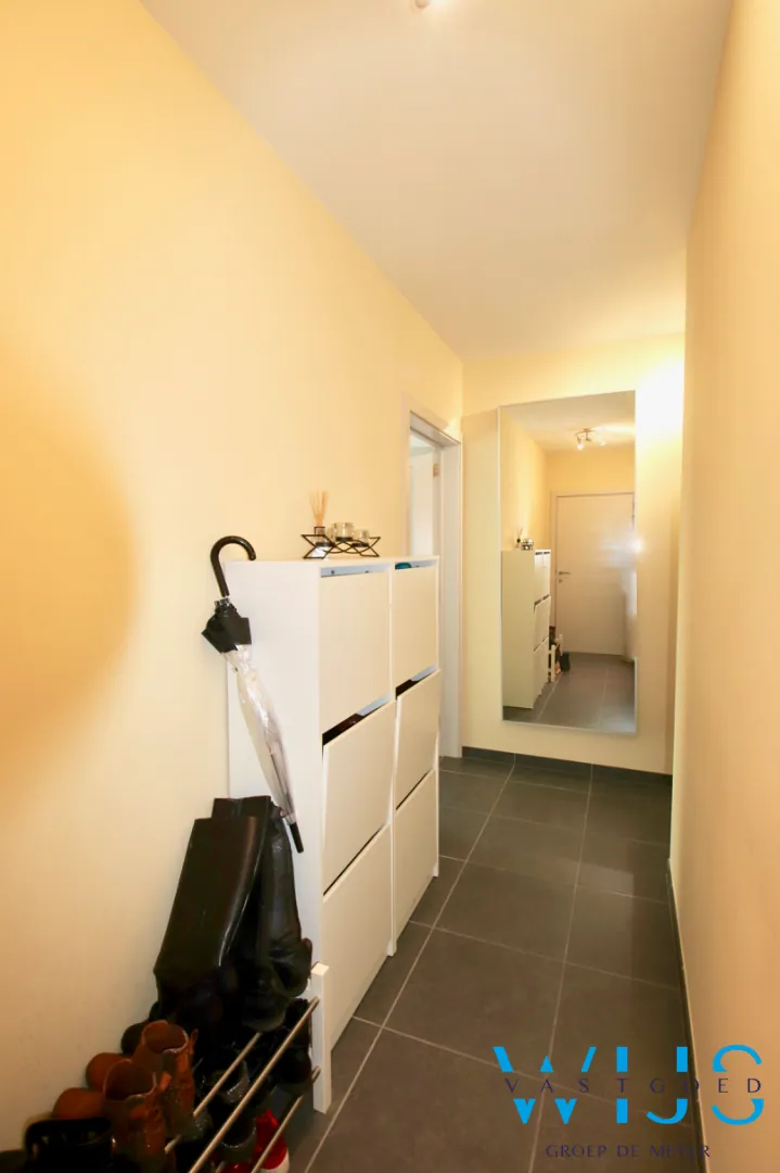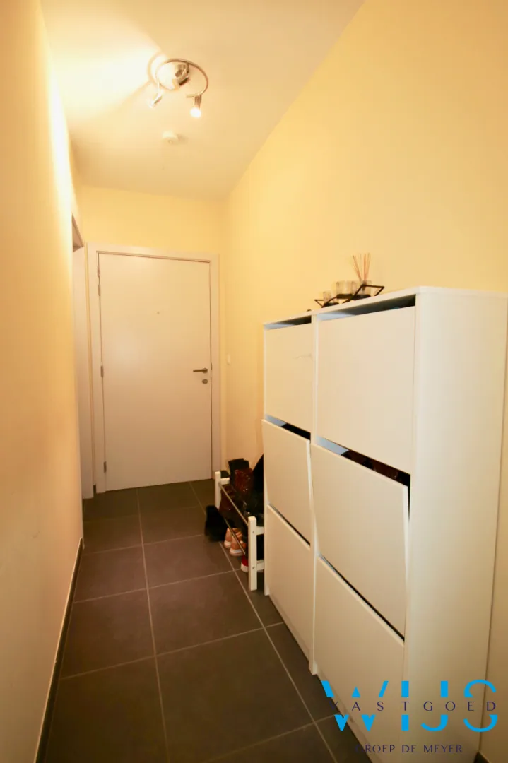 Indeling: inkomhal, wasplaats + berging, lichtrijke leefruimte met open keuken incl. toestellen, 1 slaapkamer, apart toilet, badkamer met inloopdouche, zonneterras (voorkant) en bovengrondse garage met elektrische poort.
