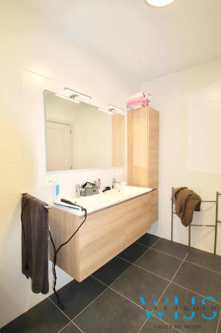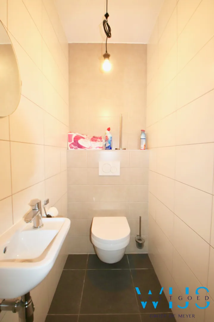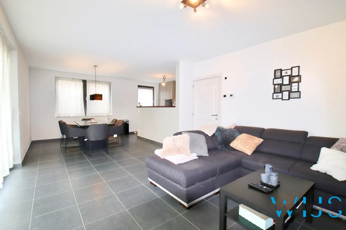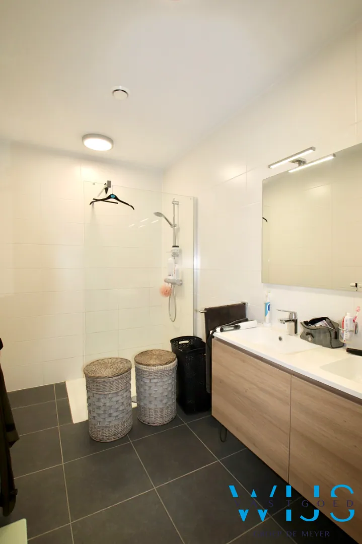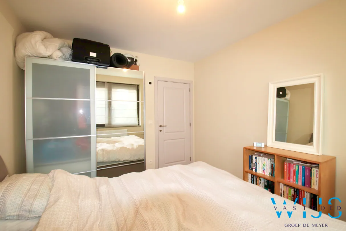 Indeling: inkomhal, wasplaats + berging, lichtrijke leefruimte met open keuken incl. toestellen, 1 slaapkamer, apart toilet, badkamer met inloopdouche, zonneterras (voorkant) en bovengrondse garage met elektrische poort.