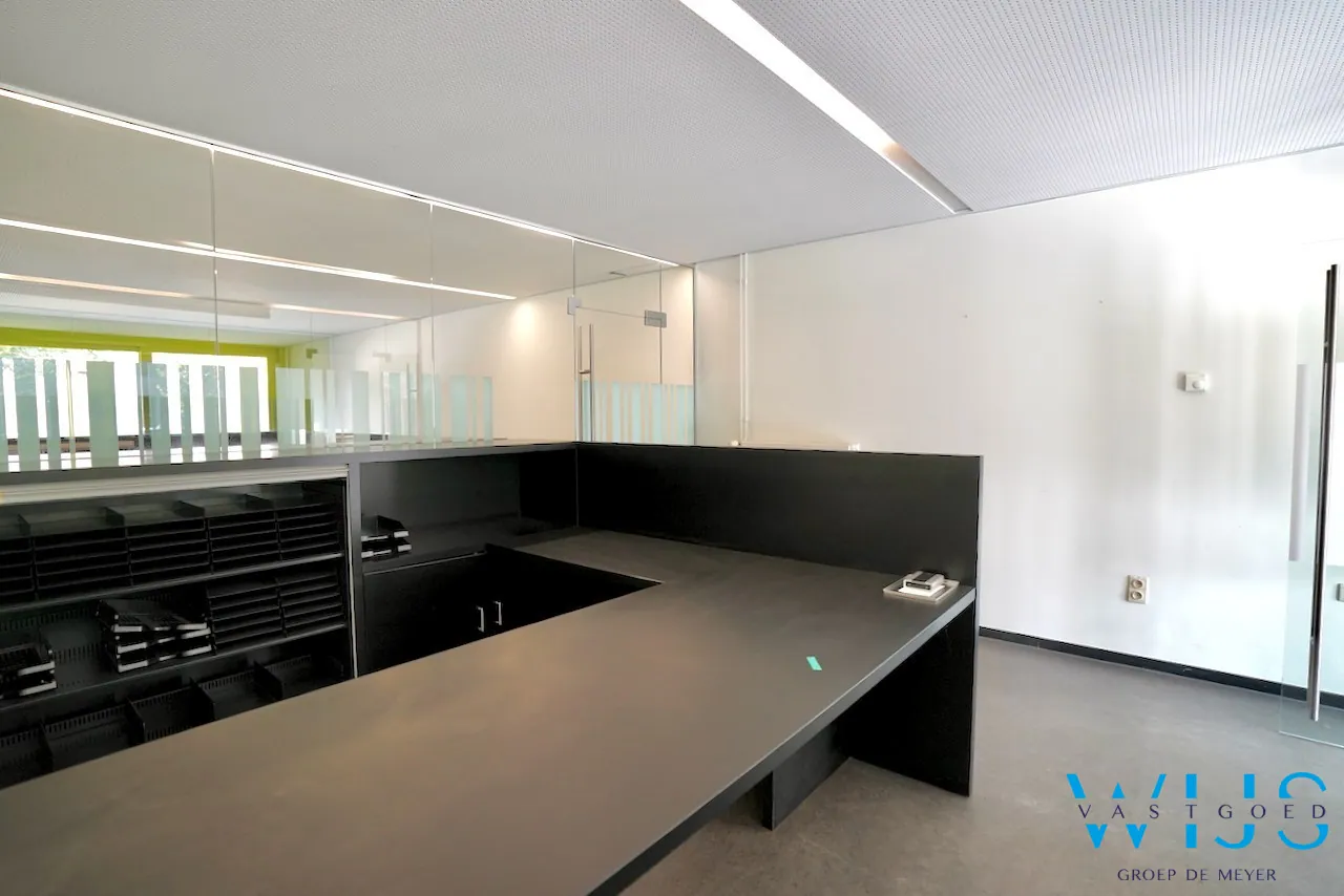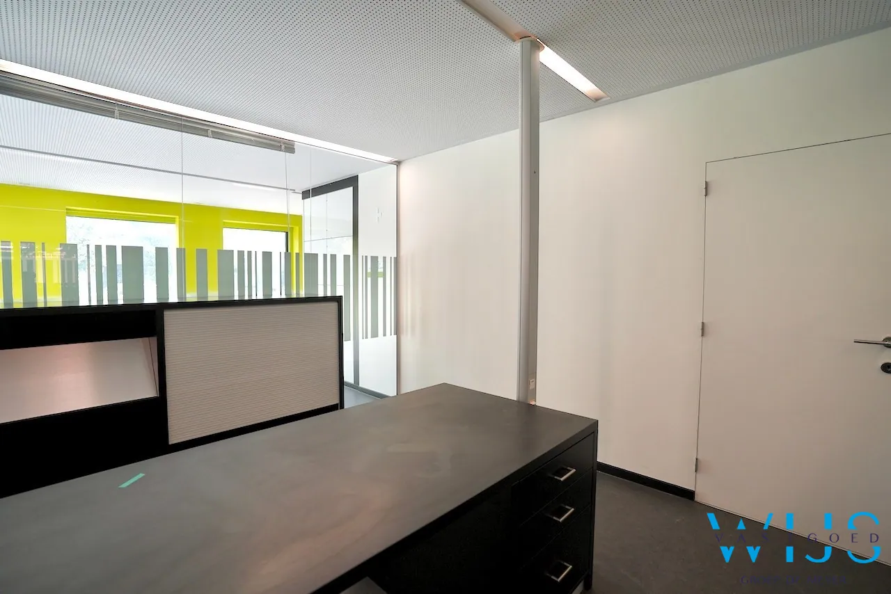 Indeling: inkom, multifunctionele ruimte opgedeeld in aparte bureauruimtes, hal, apart toilet, keuken, berging en een stockage ruimte (voormalige kluis).