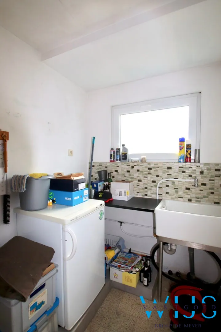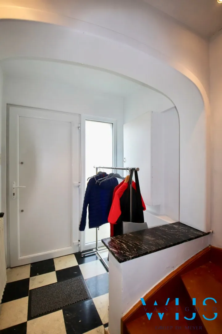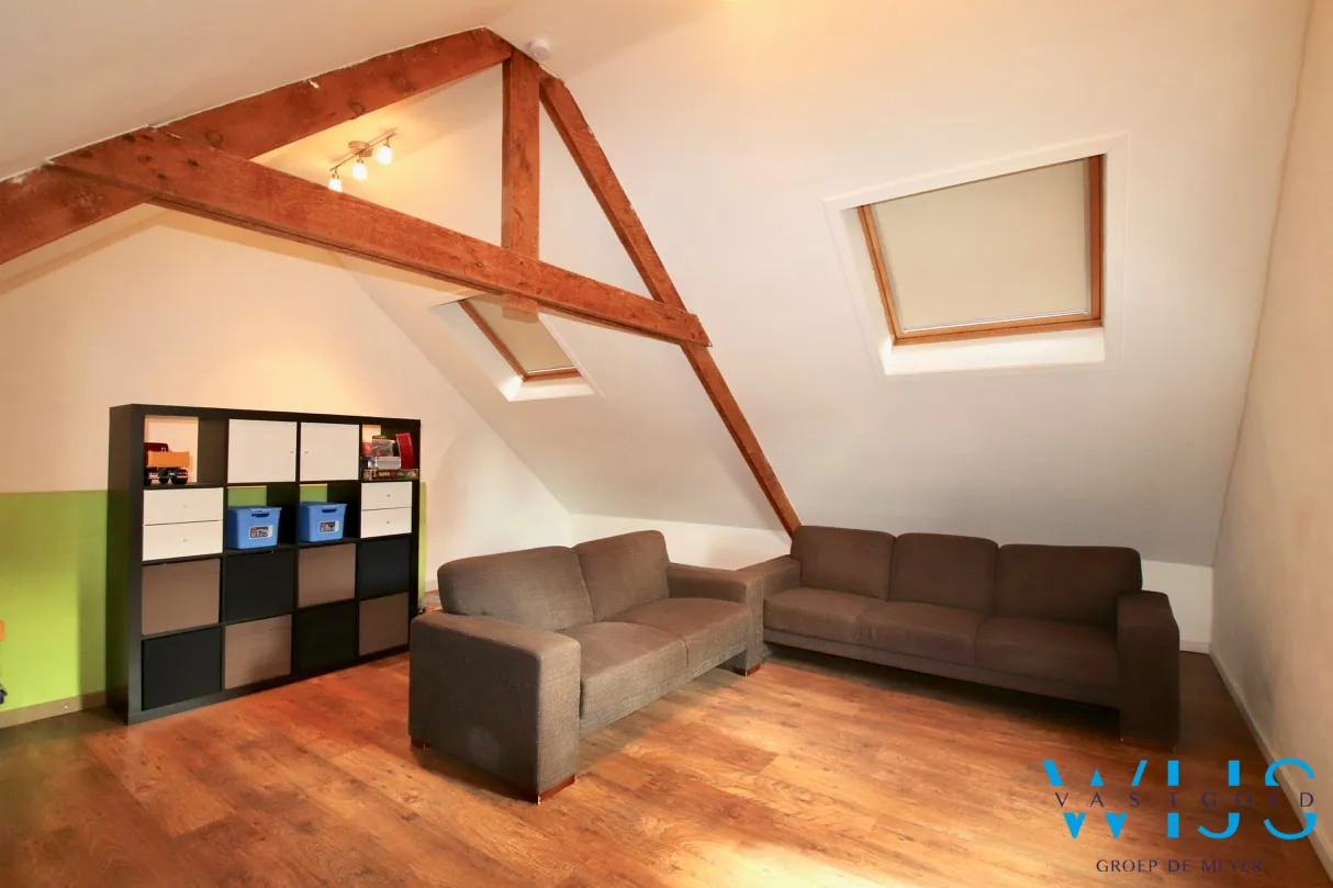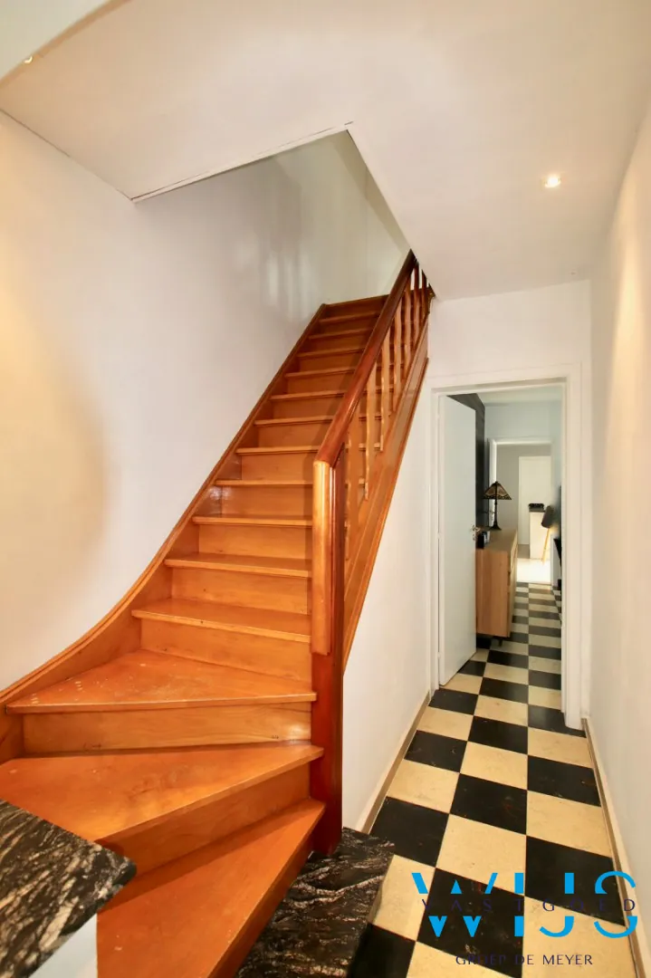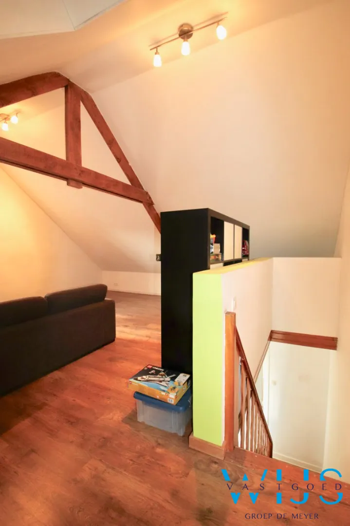 Indeling: Inkom, prachtige leefruimte uit 2 delen met authentieke elementen, keukenruimte met eiland en alle toestellen + bergplaats onder trap, wasplaats en het apart toilet.