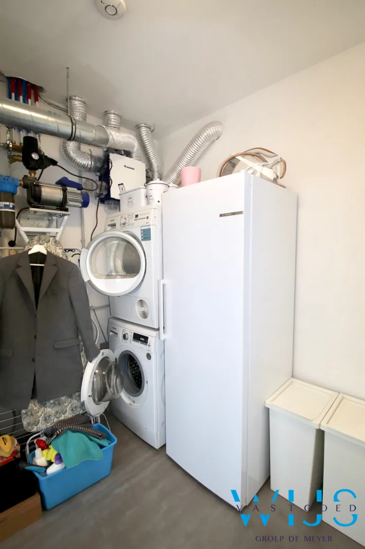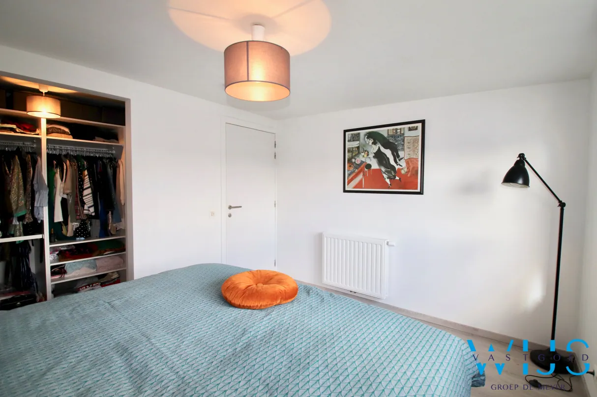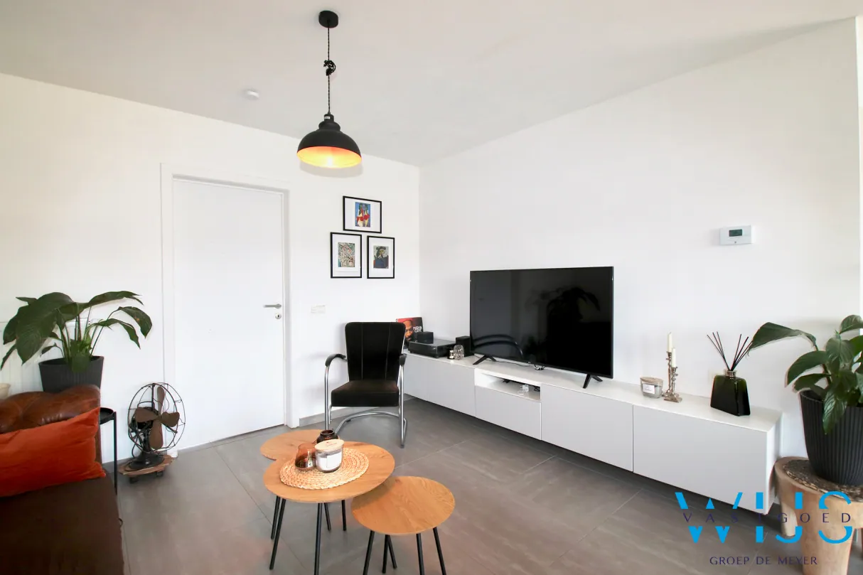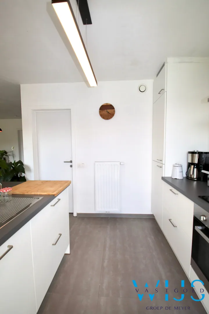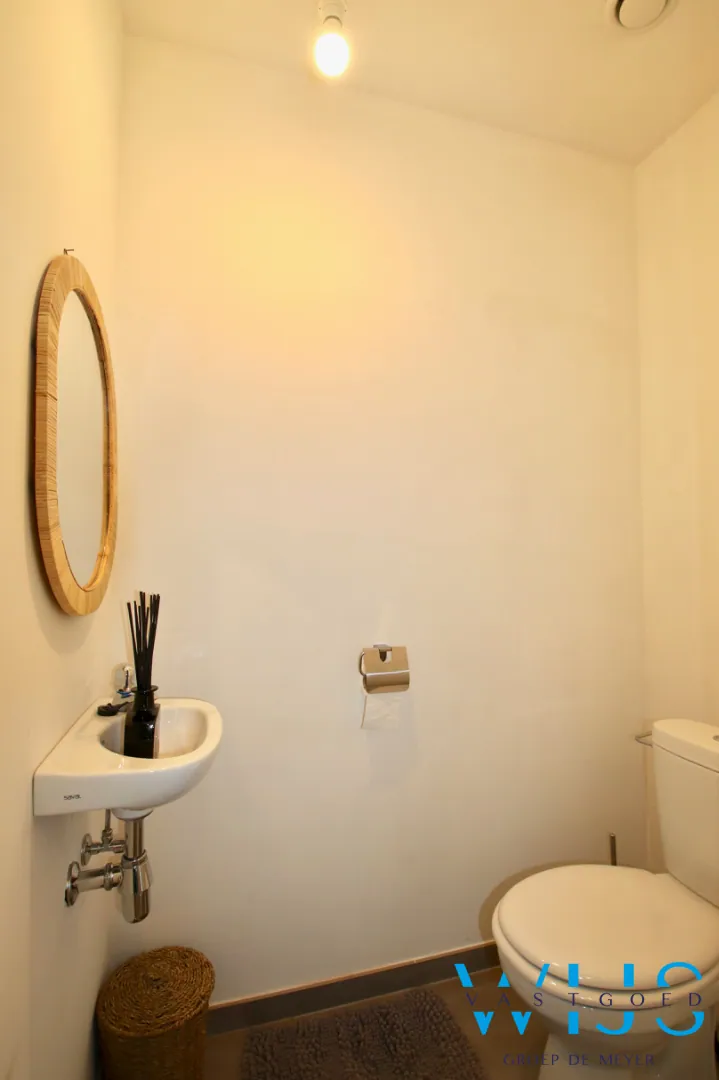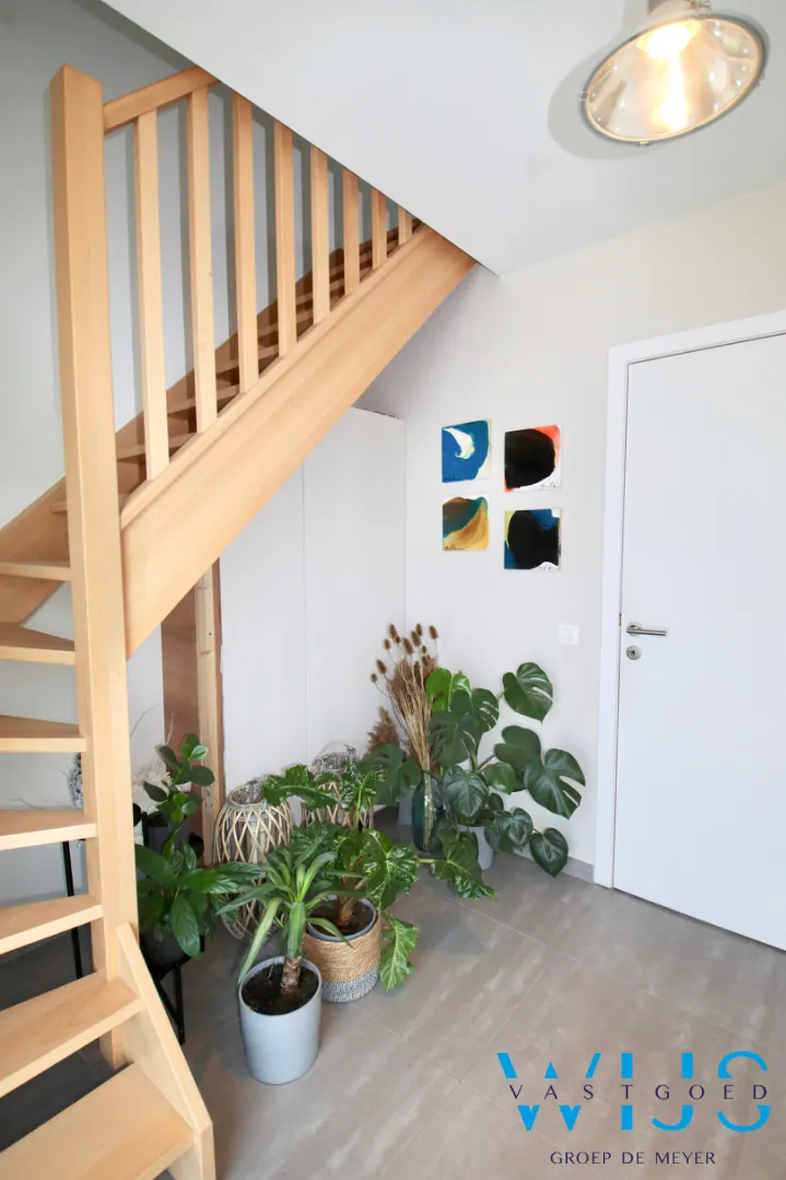 Indeling: Inkomhal met vestiaireruimte & apart toilet, leefruimte met zit- en eetruimte, open keuken incl.toestellen, berging/wasplaats en de ZUIDgerichte tuin met zonneterras en de 2 privatieve staanplaatsen.