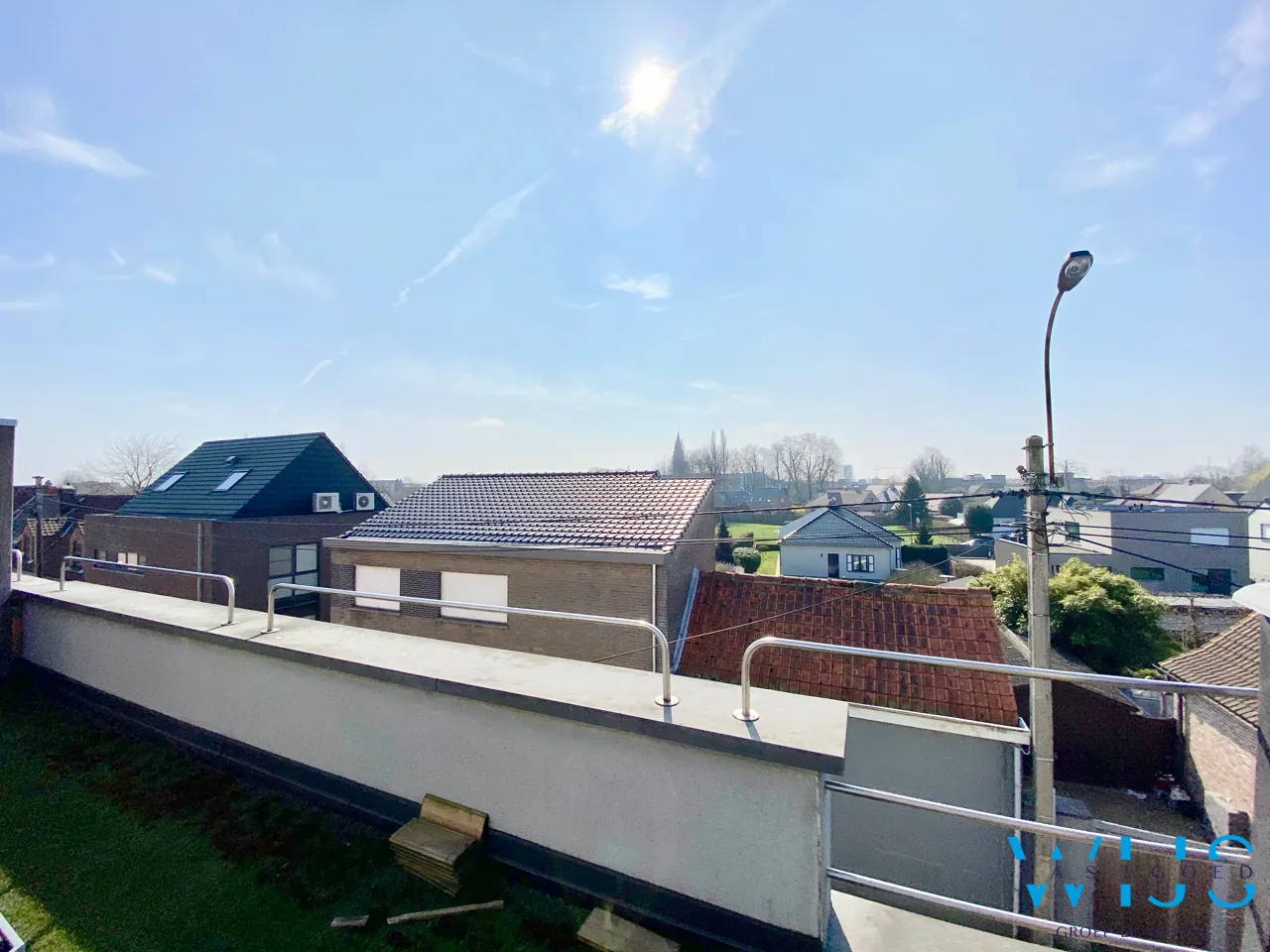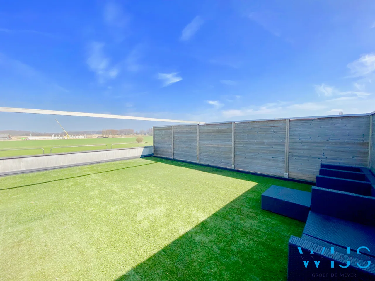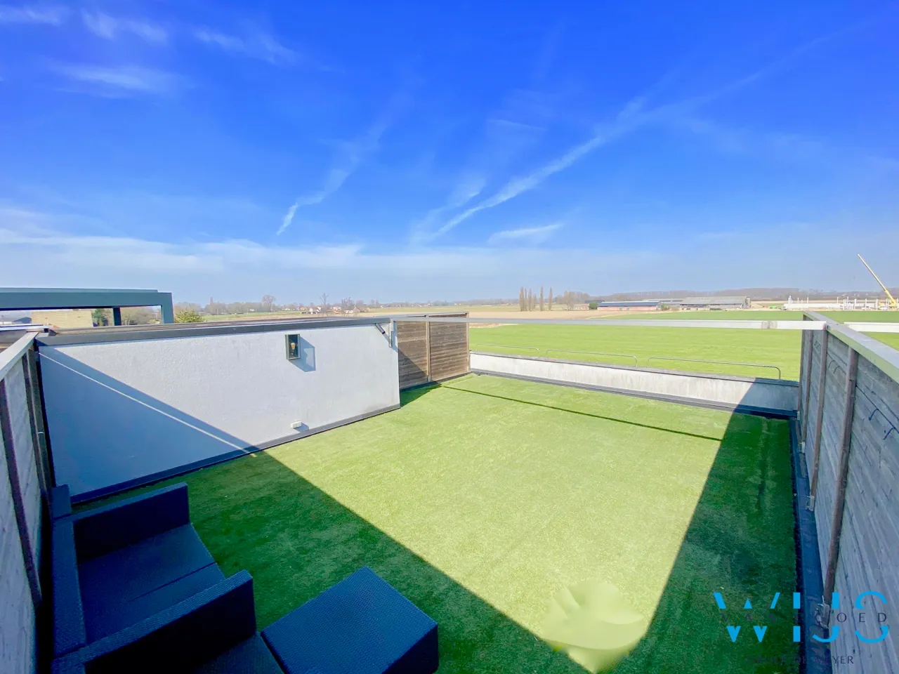- 2de verdieping: ruime prachtige leefruimte, geïnstalleerde keuken met eiland, berging, terras vooraan + het schitterende volledige dakterras!