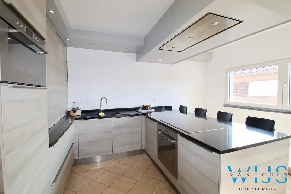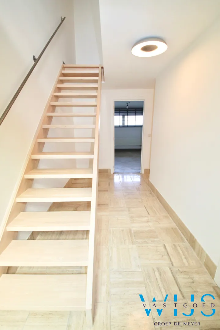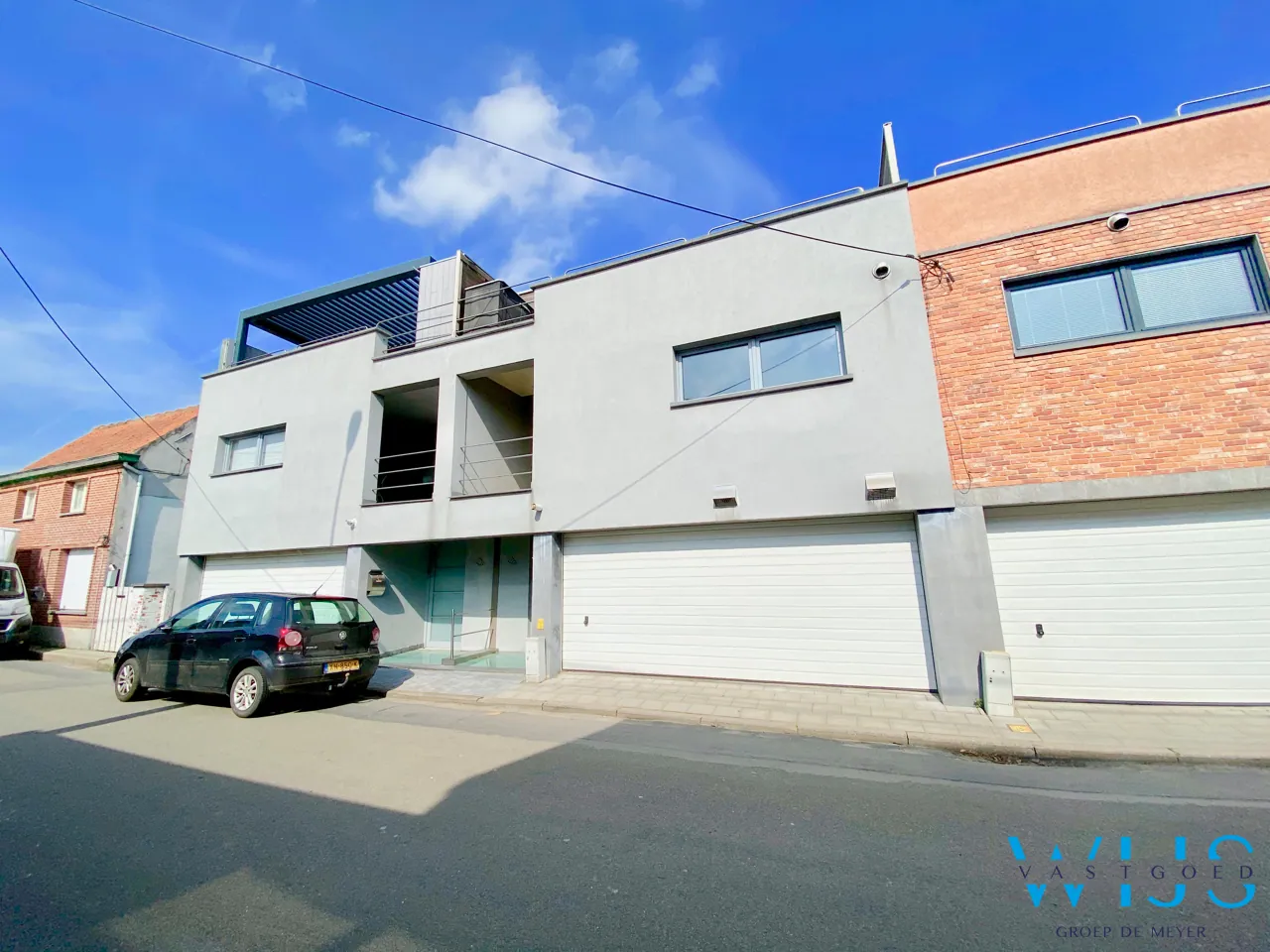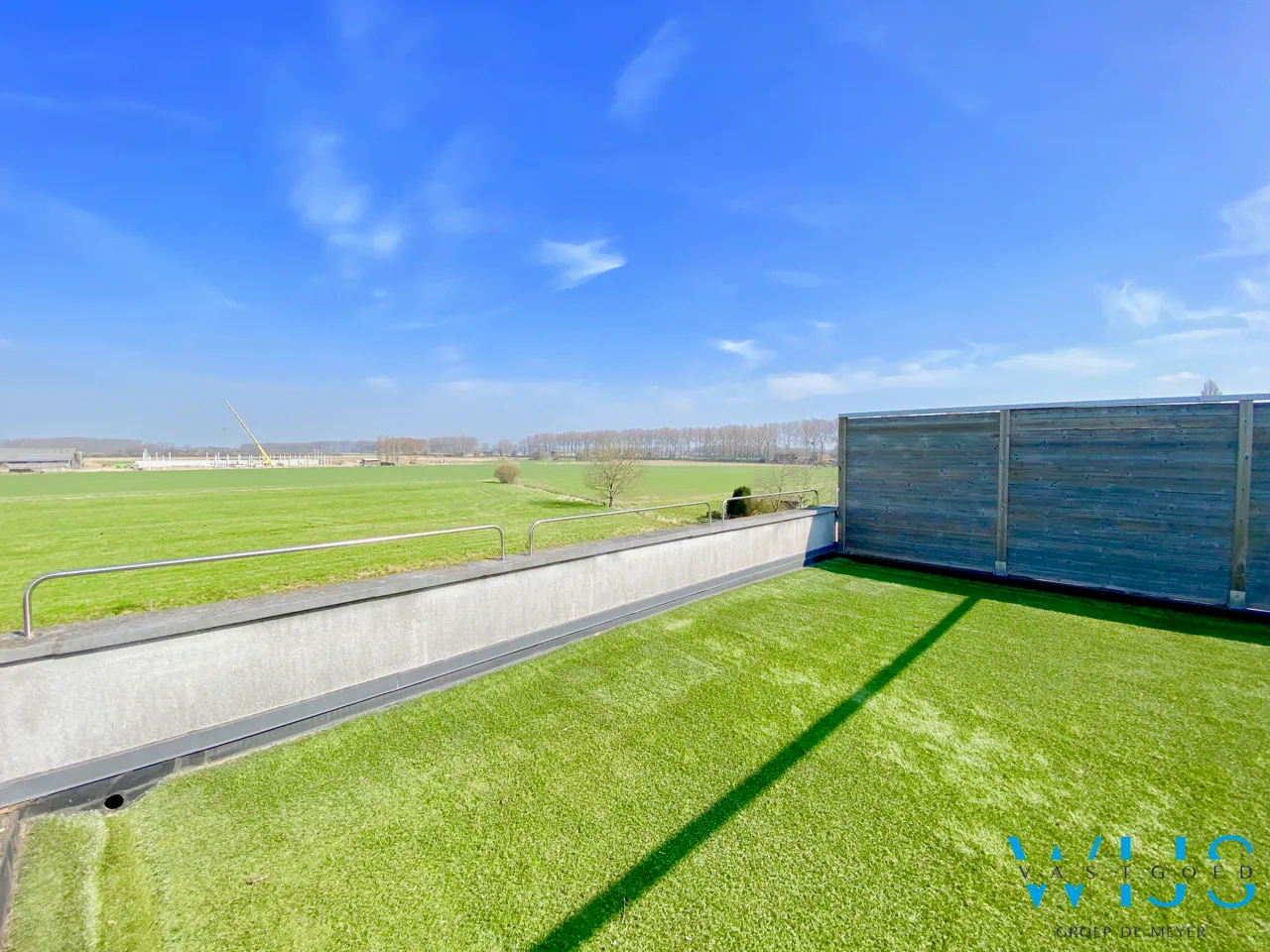 - 2de verdieping: ruime prachtige leefruimte, geïnstalleerde keuken met eiland, berging, terras vooraan + het schitterende volledige dakterras!