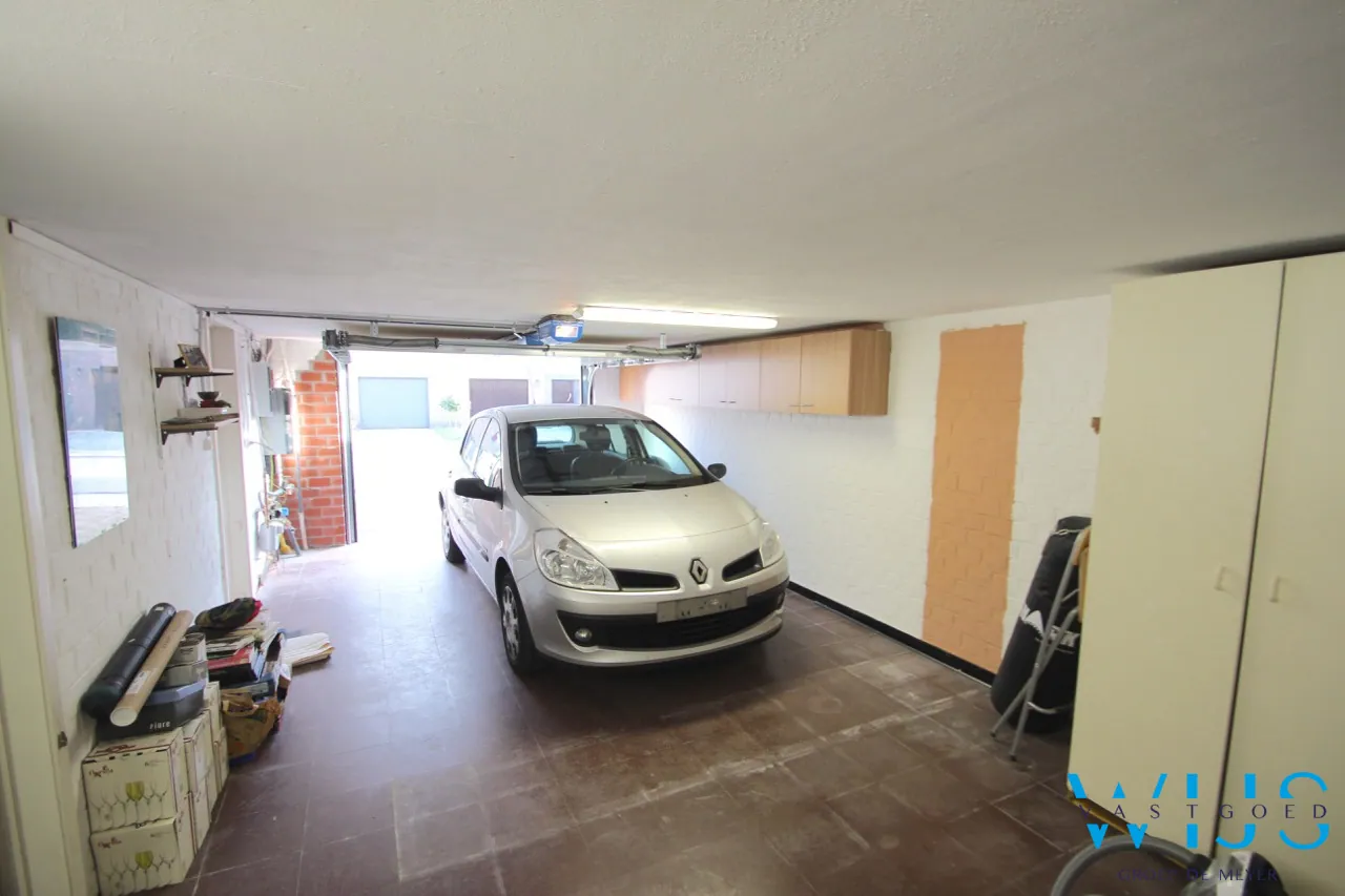 De indeling : Een inkomhal, zeer ruime garage met elektrische poort, berging/stookruimte/wasruimte, extra berging onder trap, overdekt terras en gewoon terras met zicht op de tuin waar U nog een tuinhuisje heeft.