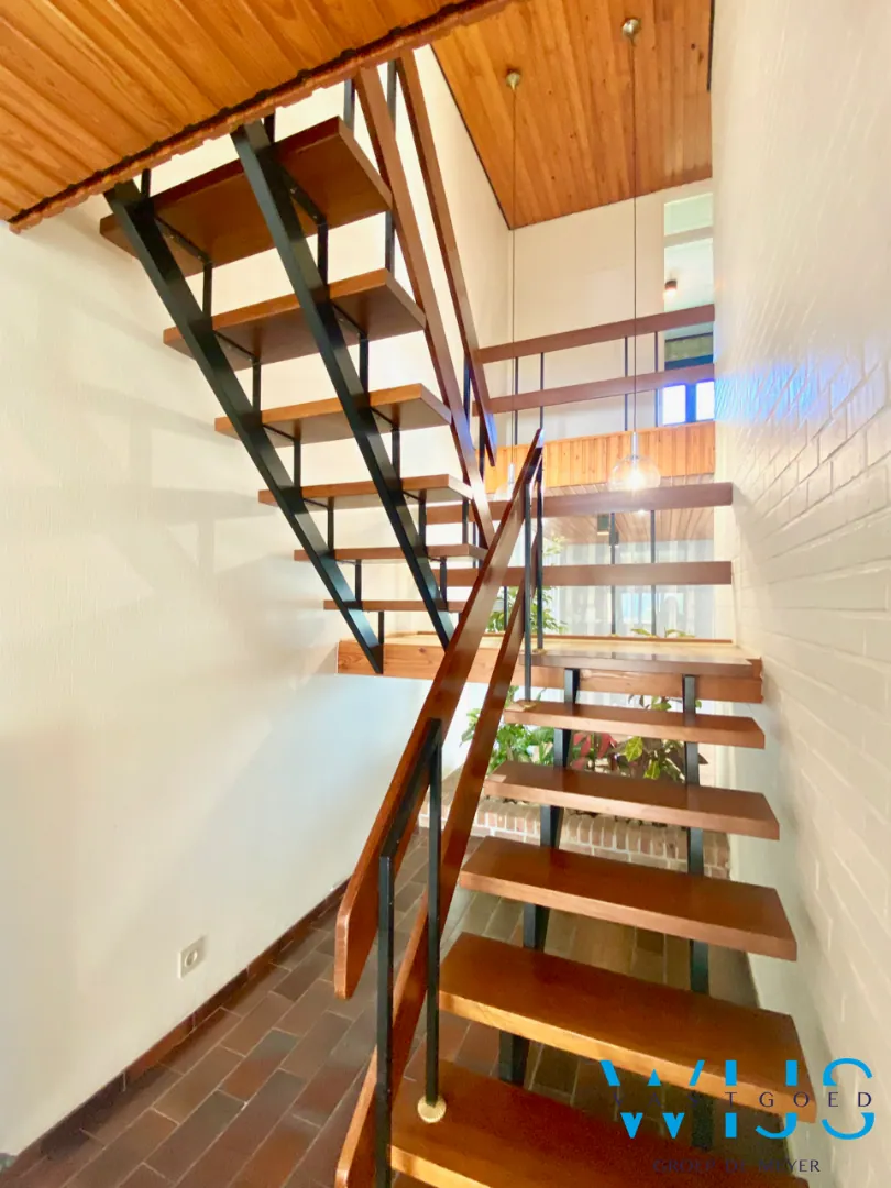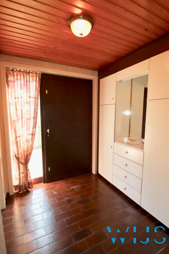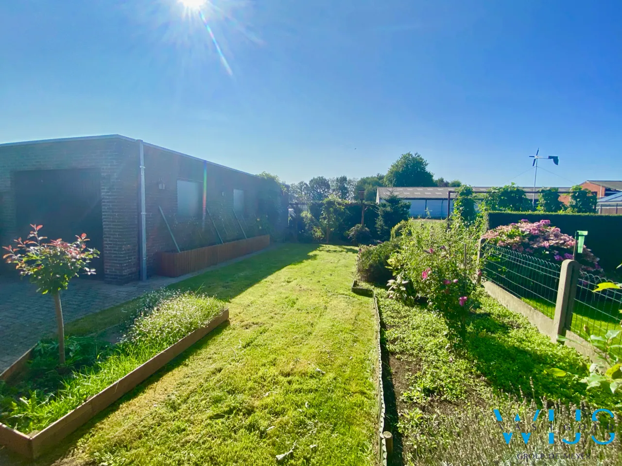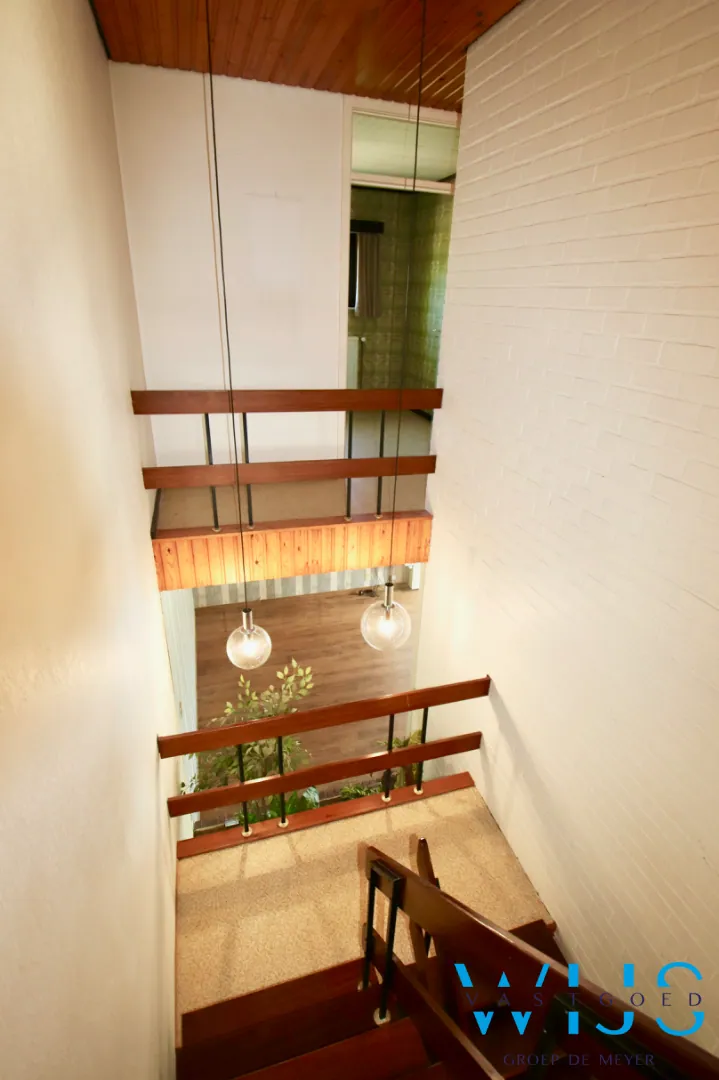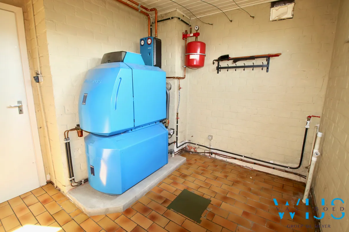 Indeling: inkom met vestiaire, aparte eetplaats, zit & tv ruimte met houthaard, open trap, eetplaats 2 + keuken, berging, apart toilet, badkamer, stookruimte/berging, veranda met aansluitend zonneterras en de tuin met de ruime aparte garage + berging met opbergruimte.