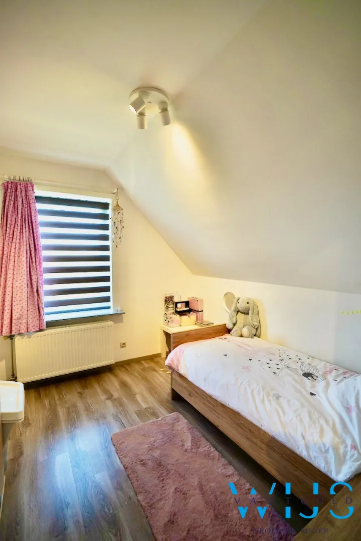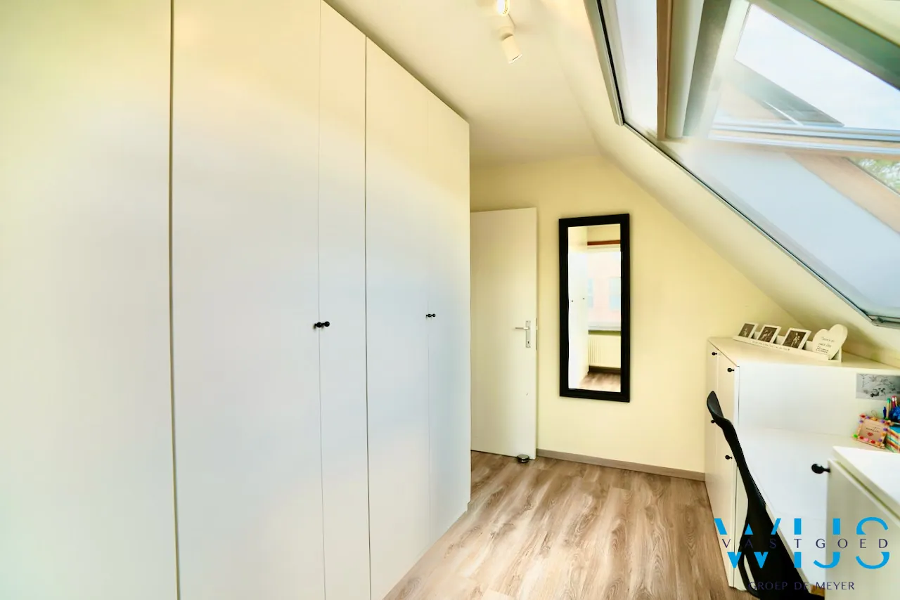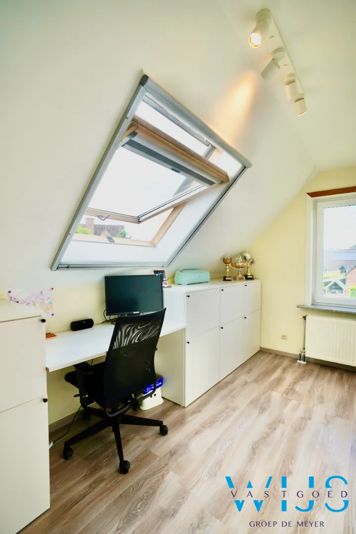 1ste verdieping: 3 volwaardige slaapkamers, dressing/bureau, badkamer met bad & douche en de opbergzolder.