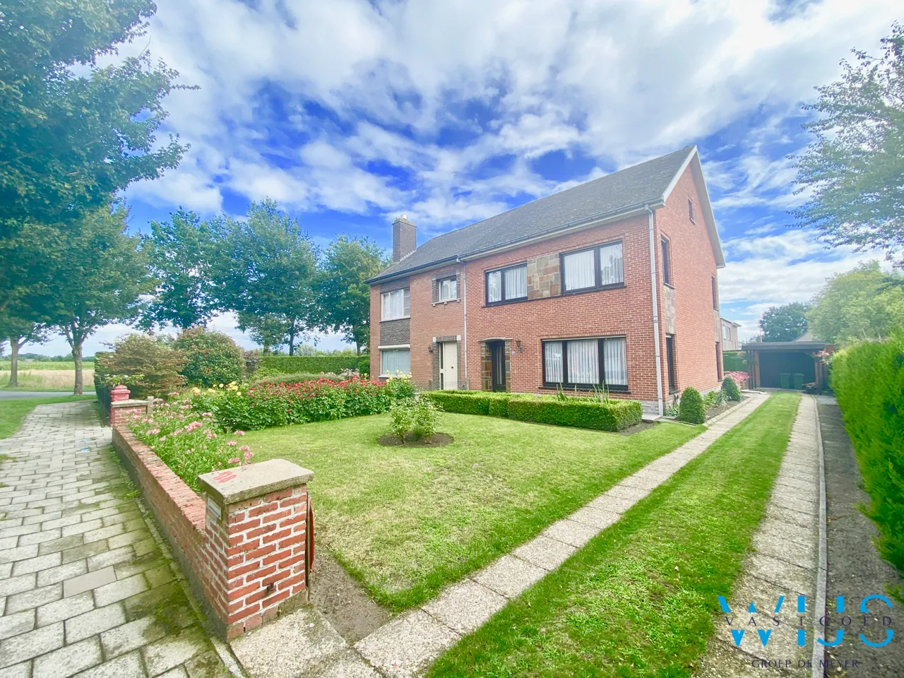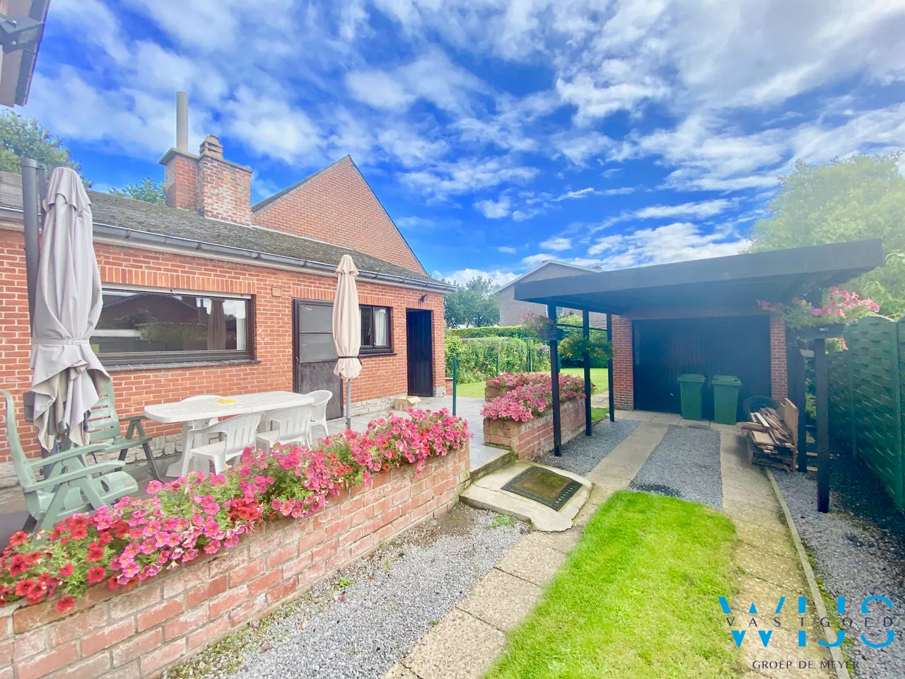 indeling: inkomhal, dubbele leefruimte, keuken met berging, wasplaats, apart toilet, zonneterras en de ZUIDgerichte ... tuin, aparte garage met berging + carport en de ruime oprit.