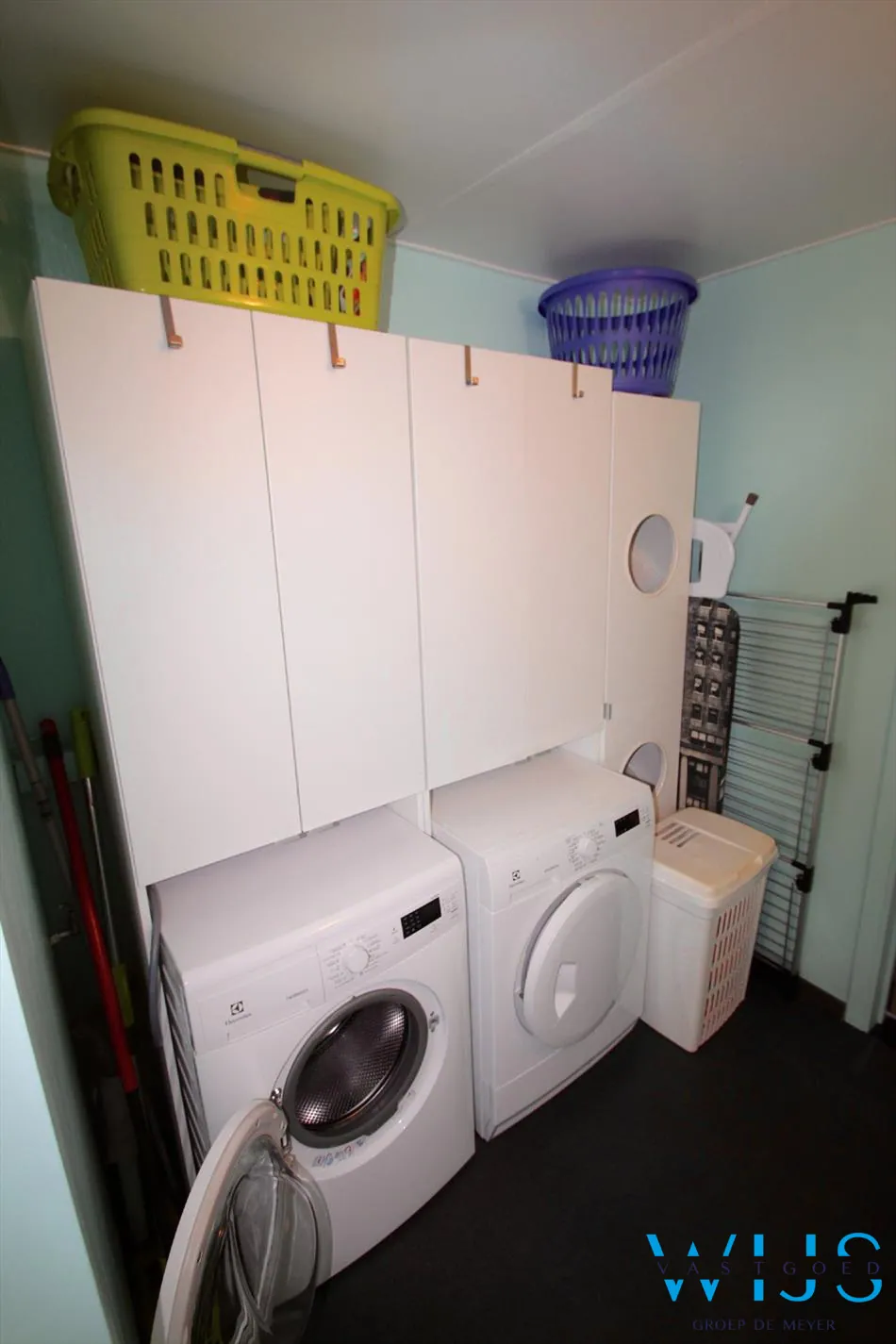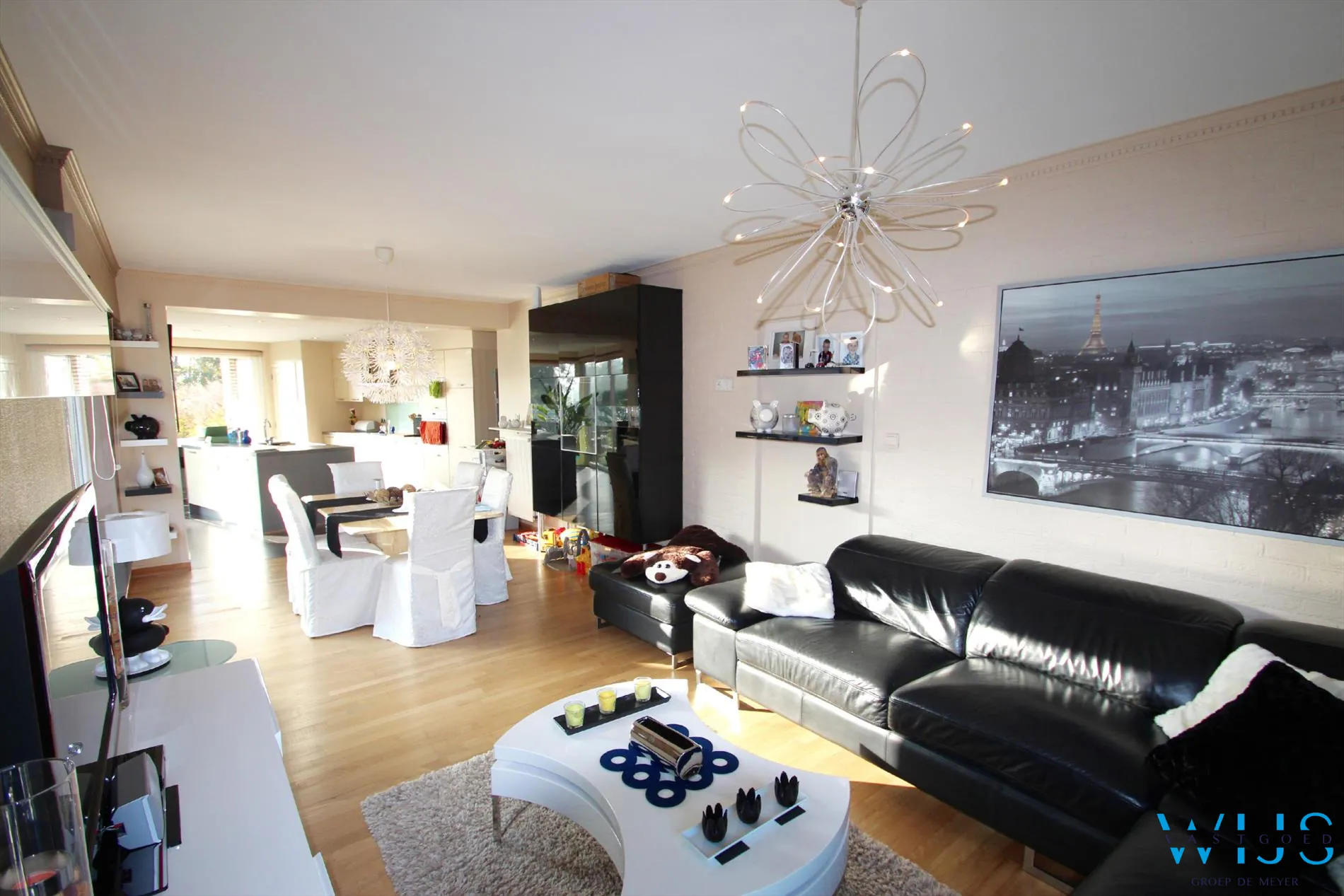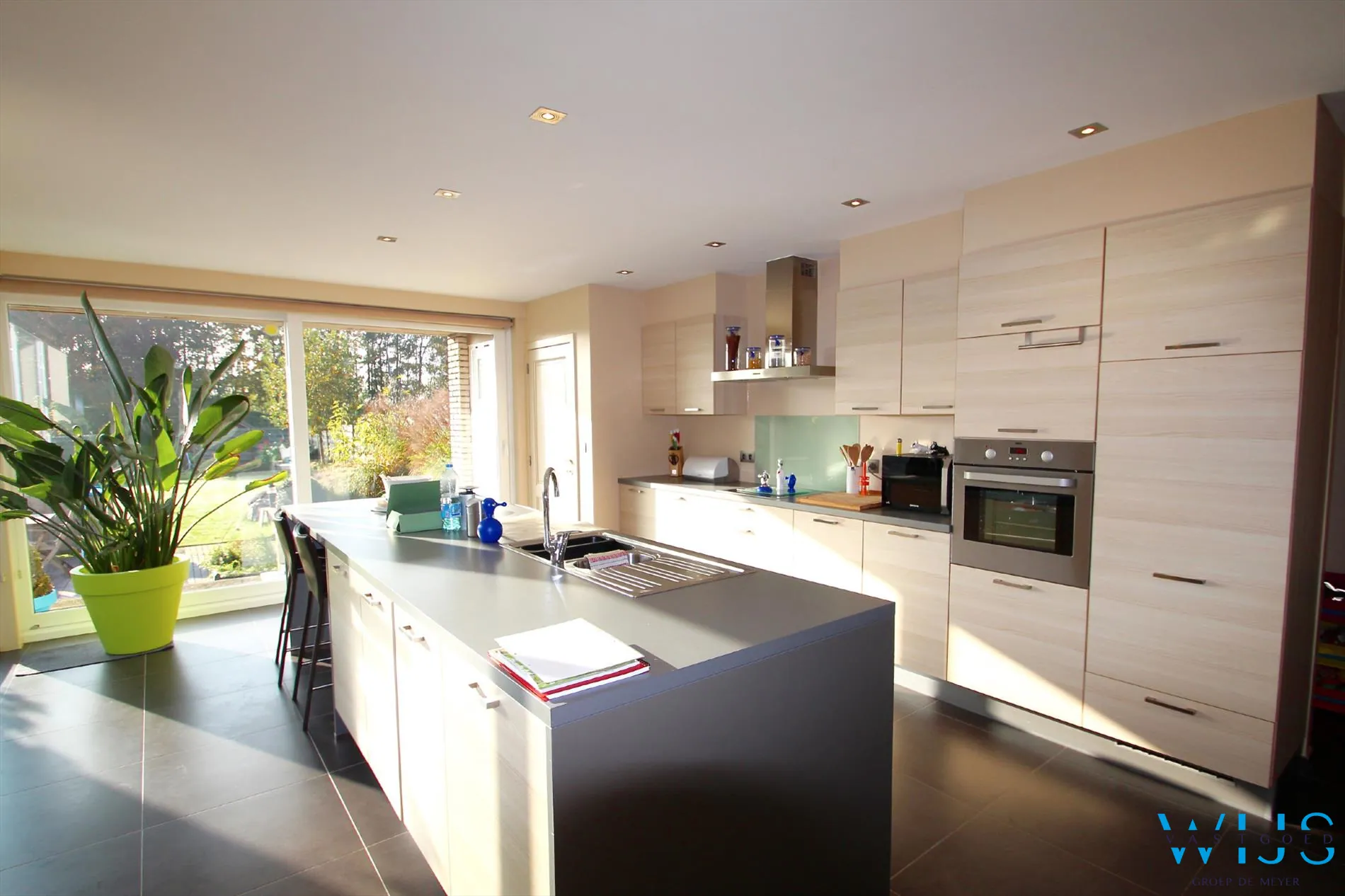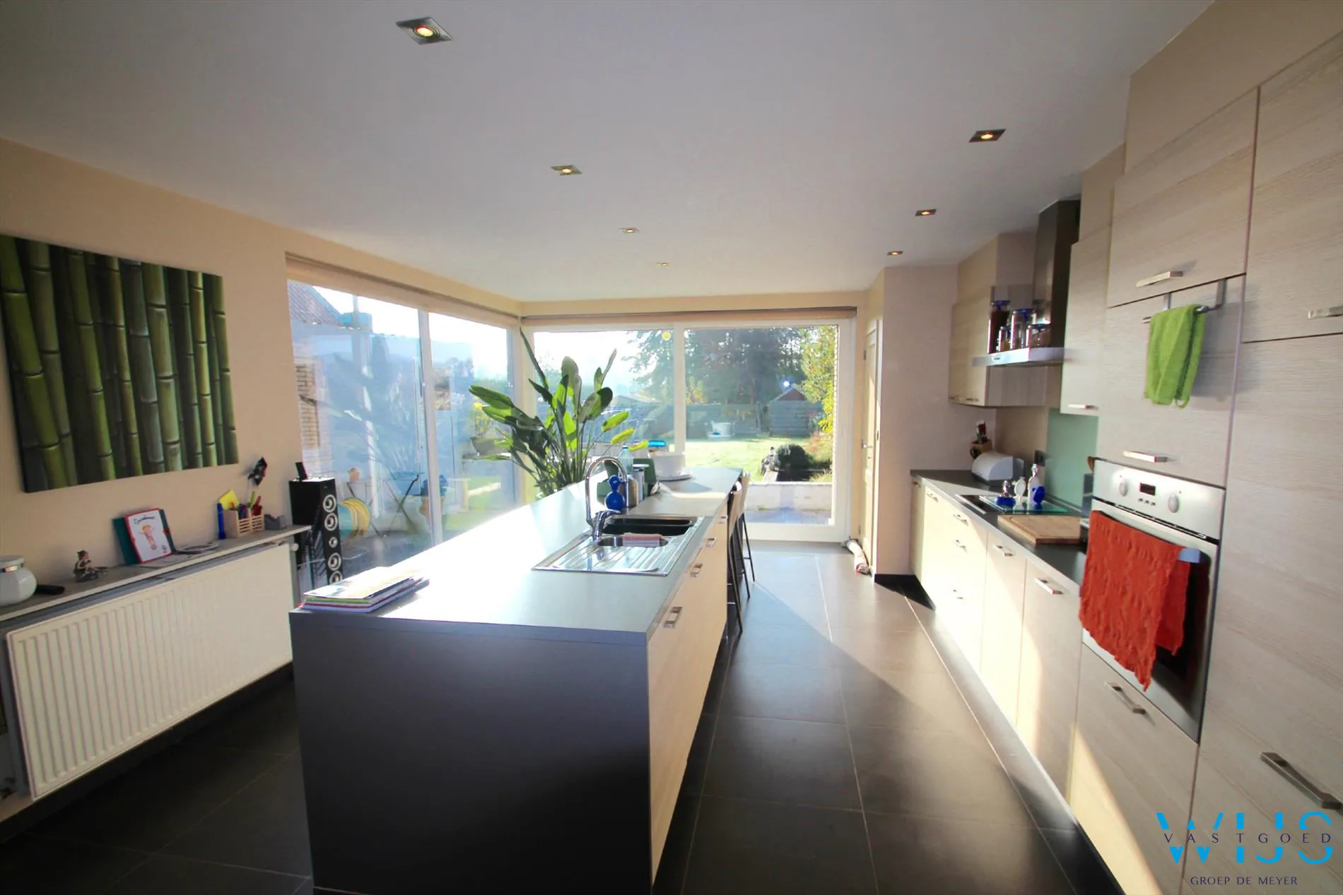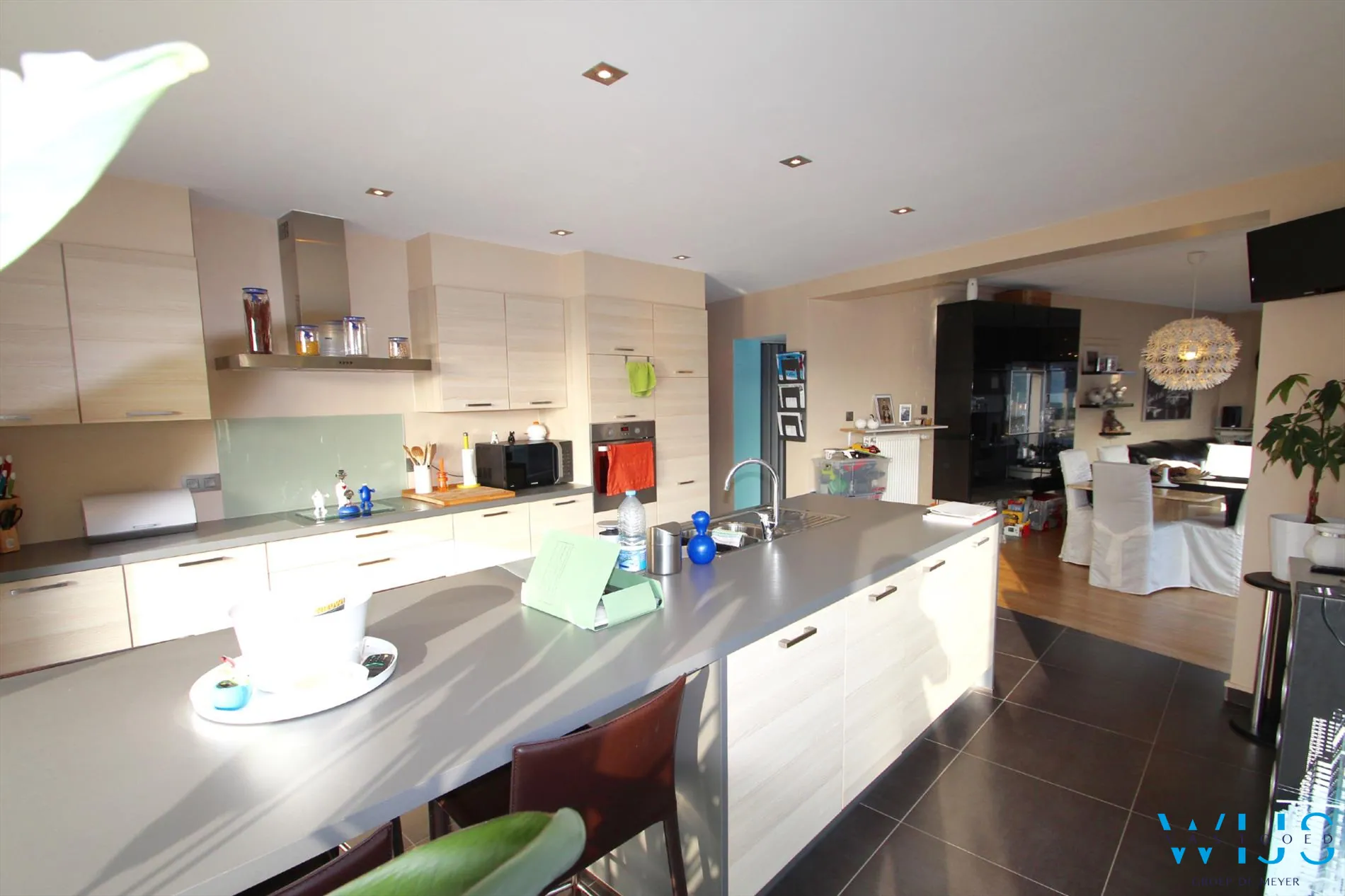 Indeling: inkom, berging/wasplaats, kelder, toilet, zeer mooie grote keuken met lang eiland en toestellen, berging aan de keuken en de lichtrijke leefruimte.