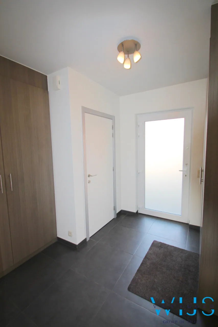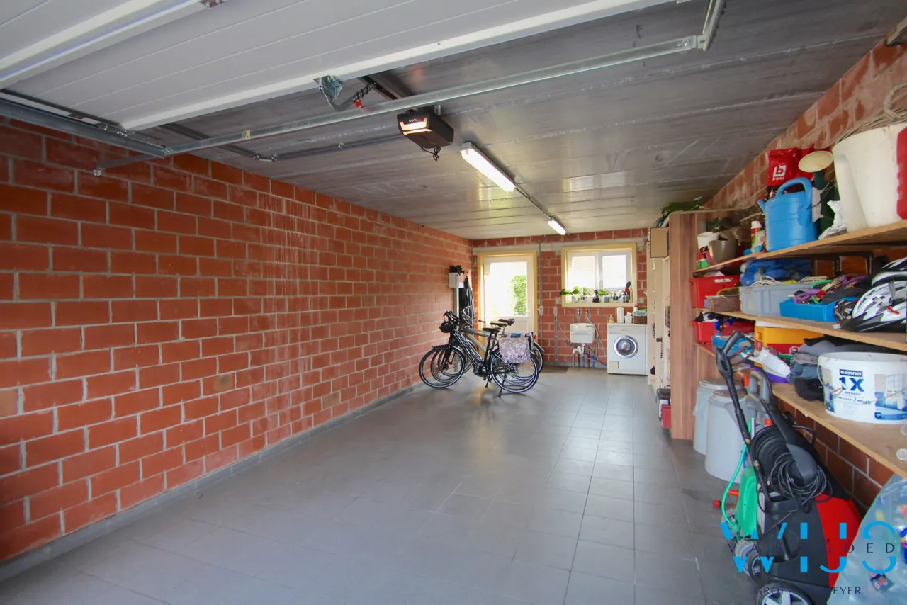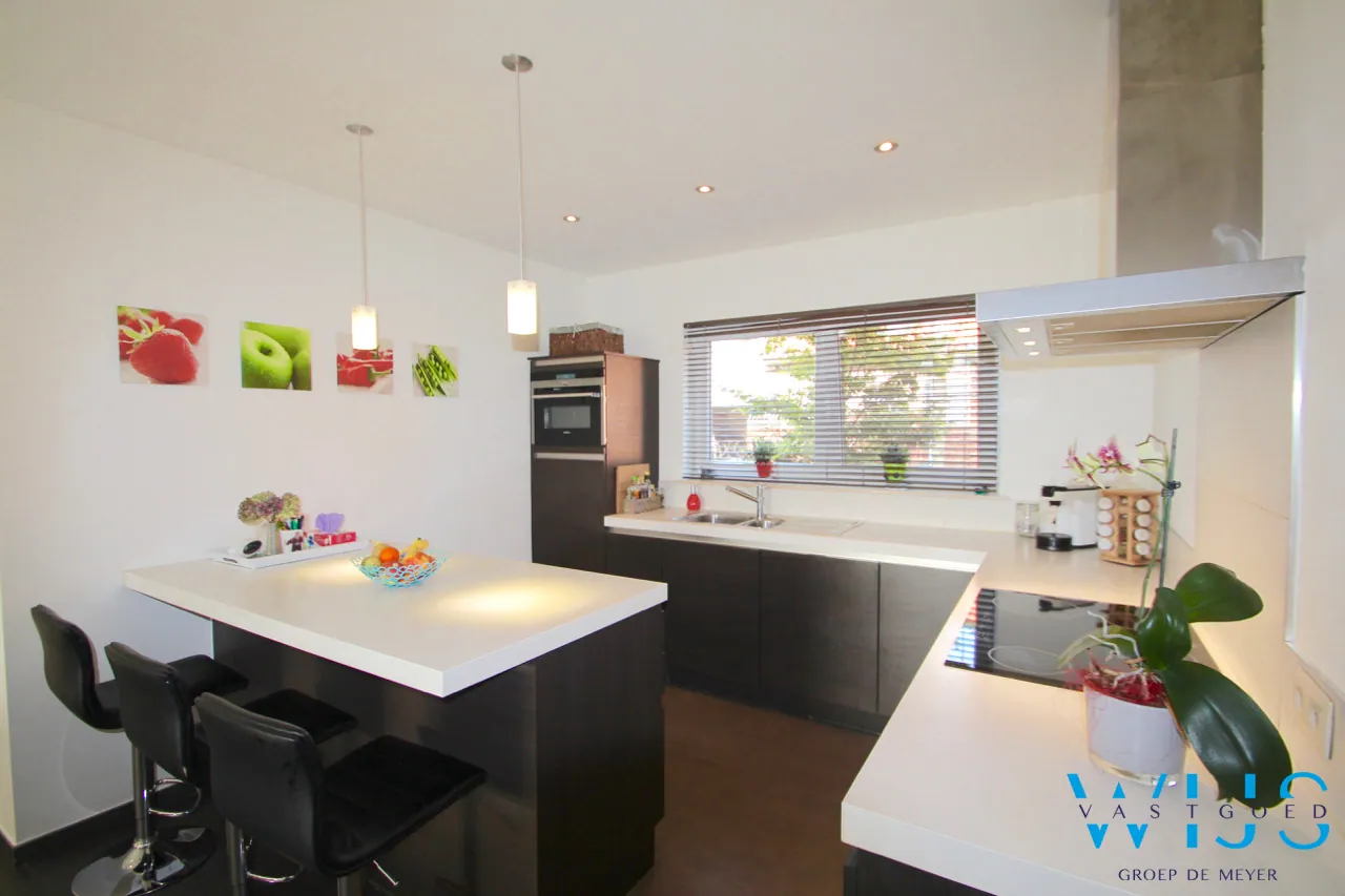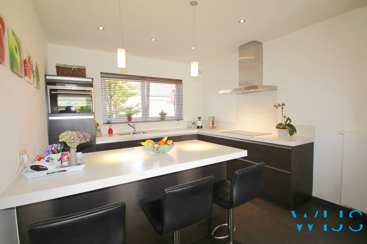 Indeling:: inkom met apart toilet en ingemaakte kasten (vestiaire), berging onder trap, ruime mooie afgewerkte keuken met kwalitatieve toestellen en eiland, lichtrijke leefruimte (zit -en eetplaats) met pelletkachel ( 2016) en toegang naar het terras, aparte doorgang naar de tuin met achterdeur, traphal. Op de 1ste verdieping is er de mooie badkamer met inloopdouche en dubbel meubel, apart toilet + 2 enorm ruime slaapkamers waarvan een met dressing.
