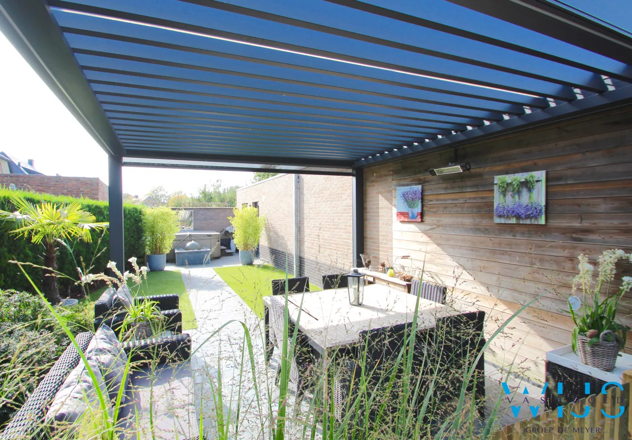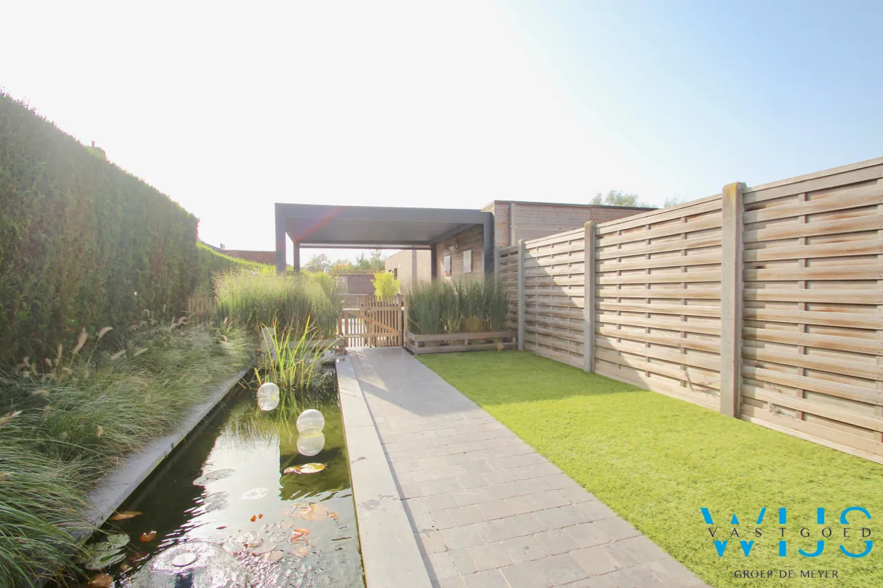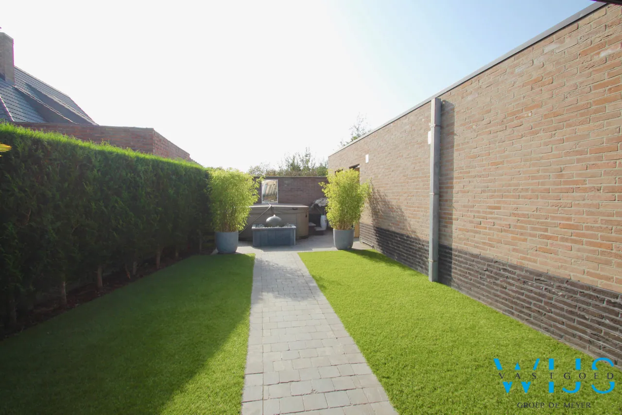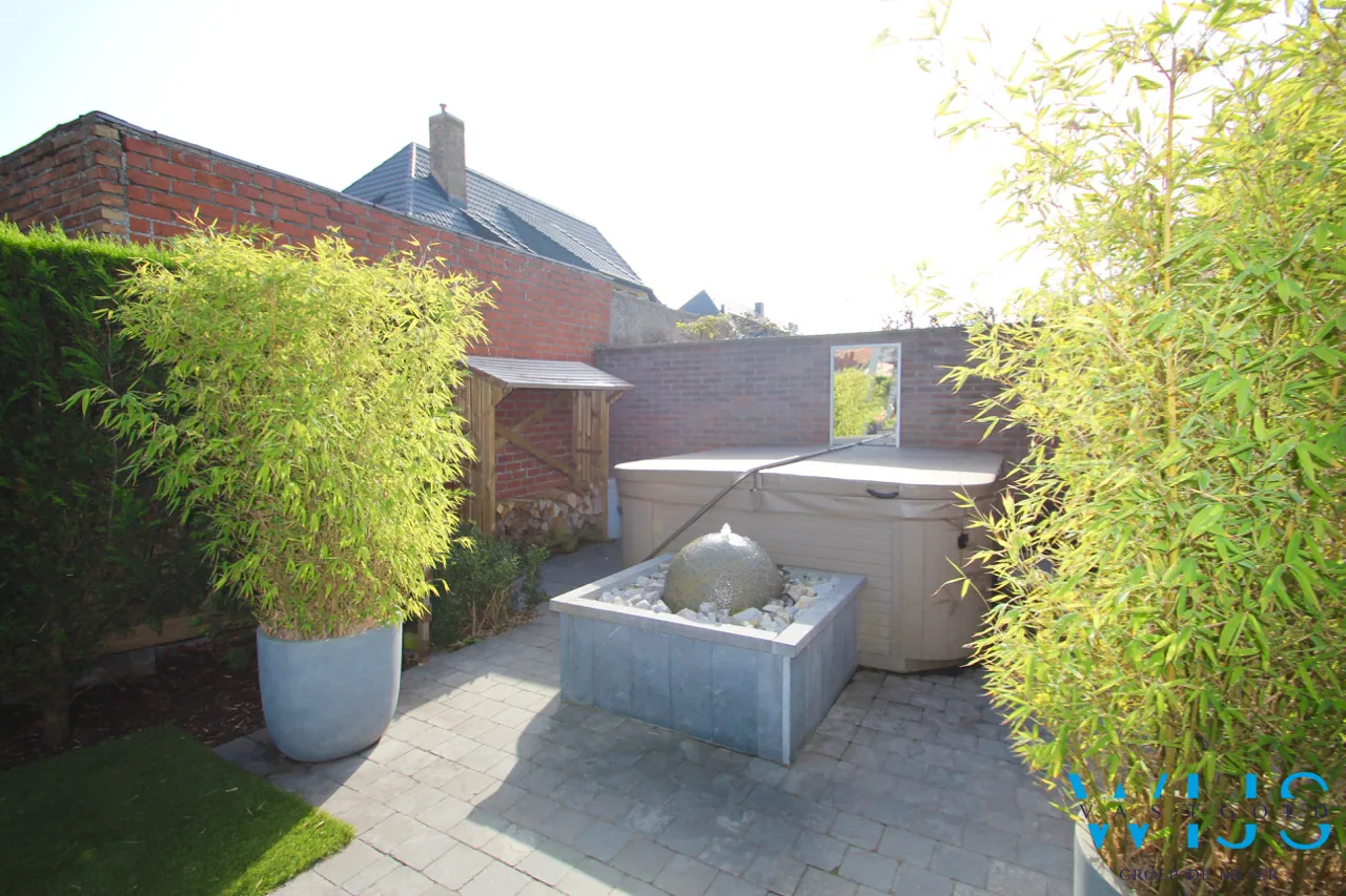 De ZUIDGERICHTE tuin werd enkele jaren geleden professioneel ... aangelegd met een lounge, kunstgras, vijver en uiteraard de BRUSTOR buitenleefruimte met elektrische zonnewering, screens en warmtestraler. Dit is een echte meerwaarde voor wie graag doorheen het jaar buiten zit ! Bovendien is er achteraan de tuin een terras met jacuzzi en daar heeft u toegang tot de ruime garage met elektrische poort.