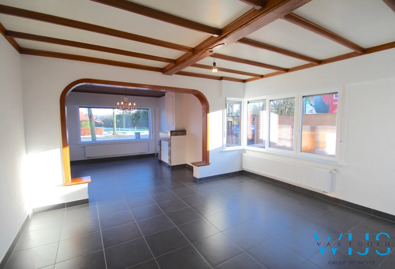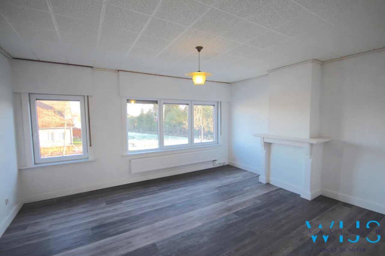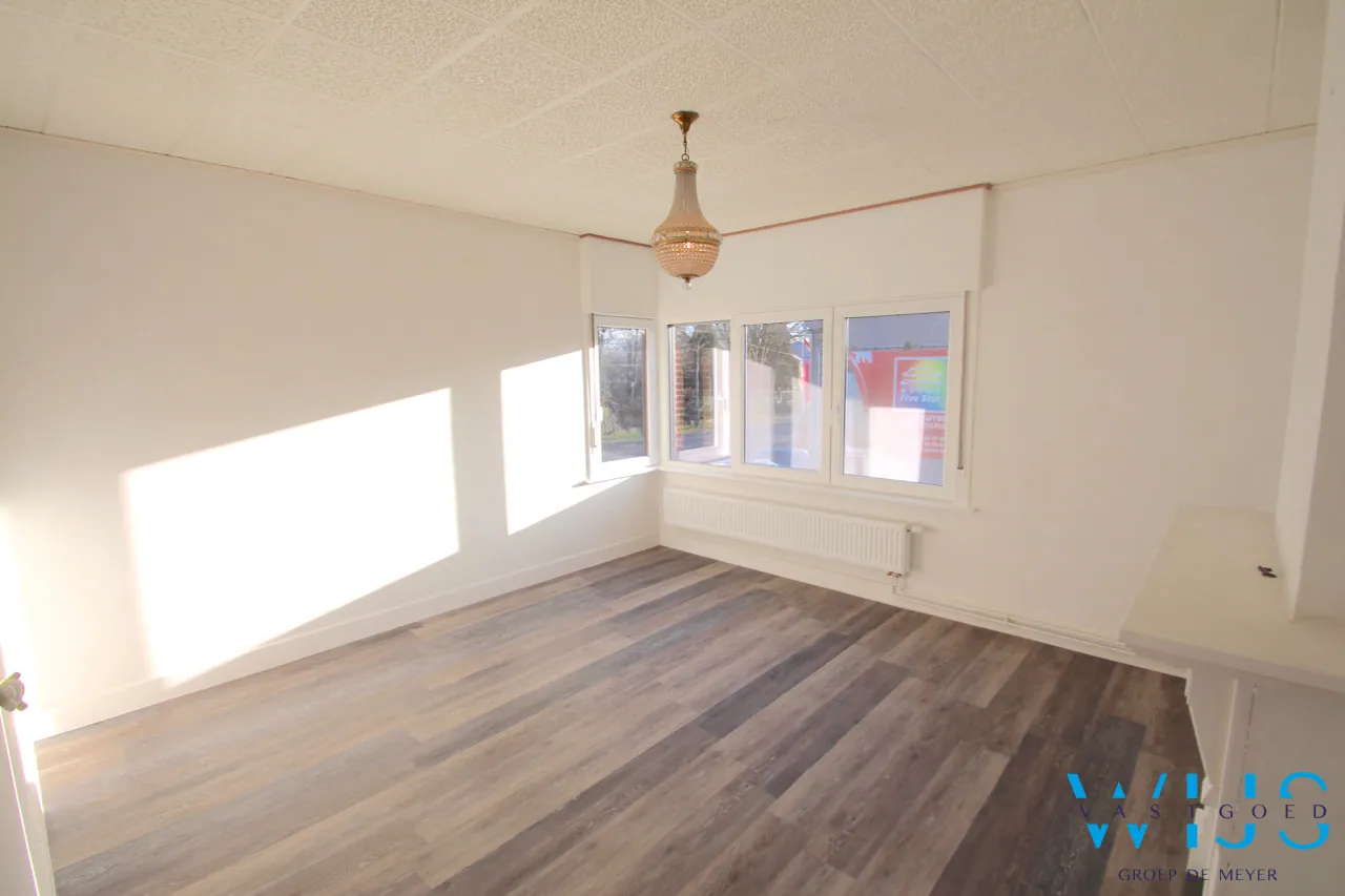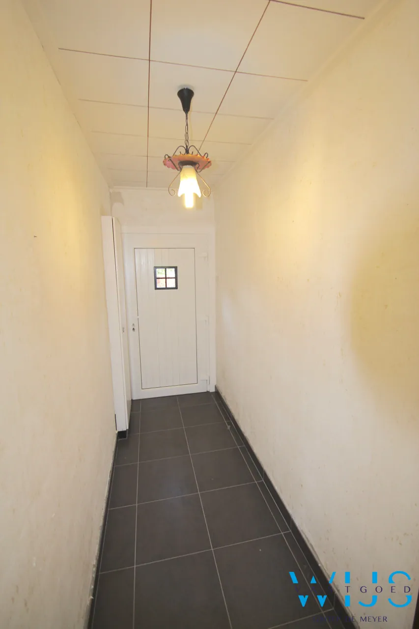 Indeling: Inkom, leefruimte uit 2 delen met veel lichtinval, knusse nieuwe keuken met toestellen en droge kelder, apart toilet en de tijdloze badkamer + wasplaats.
