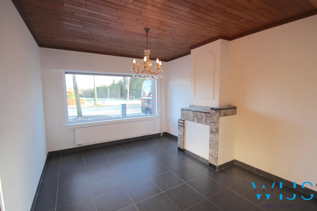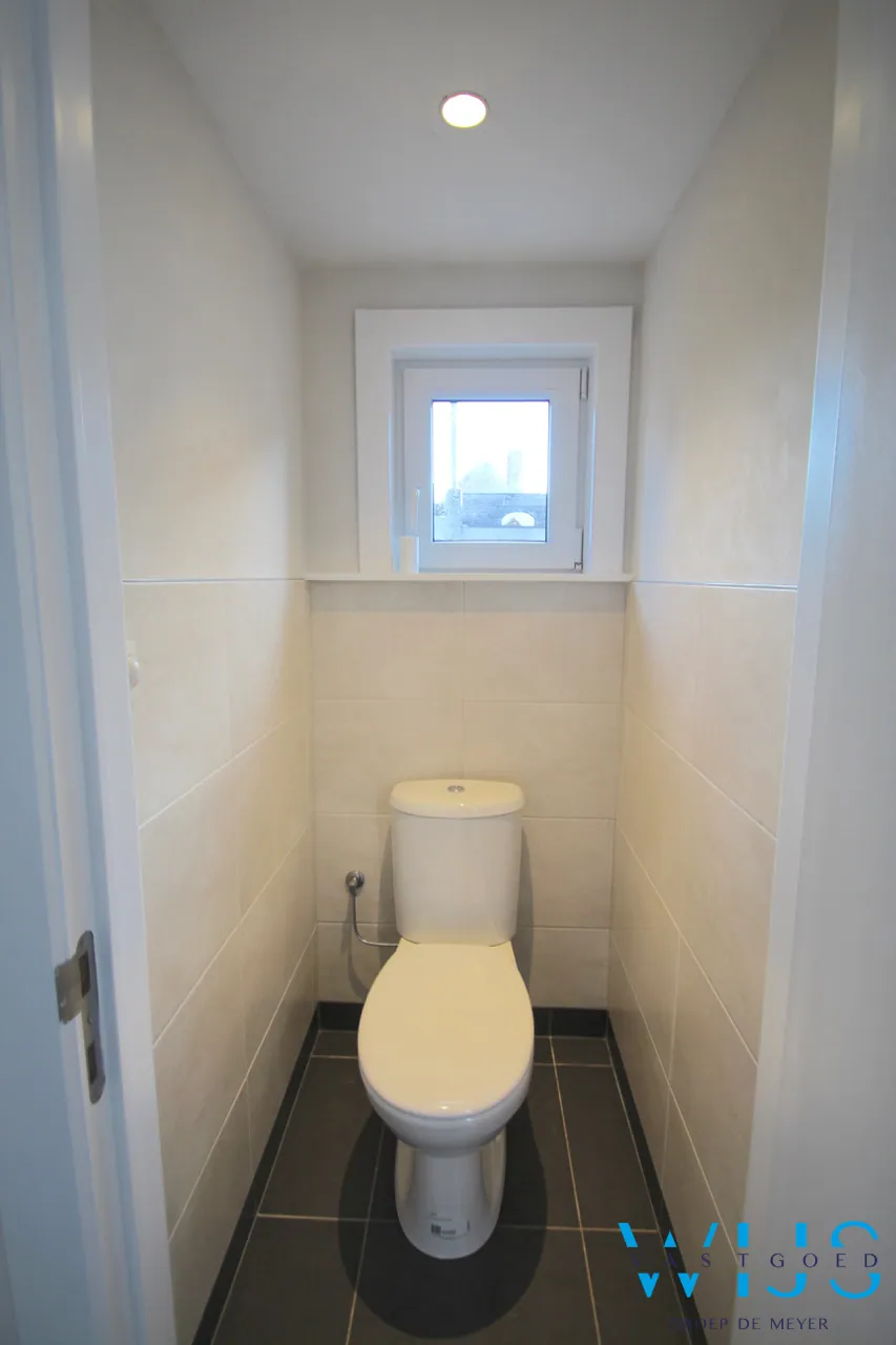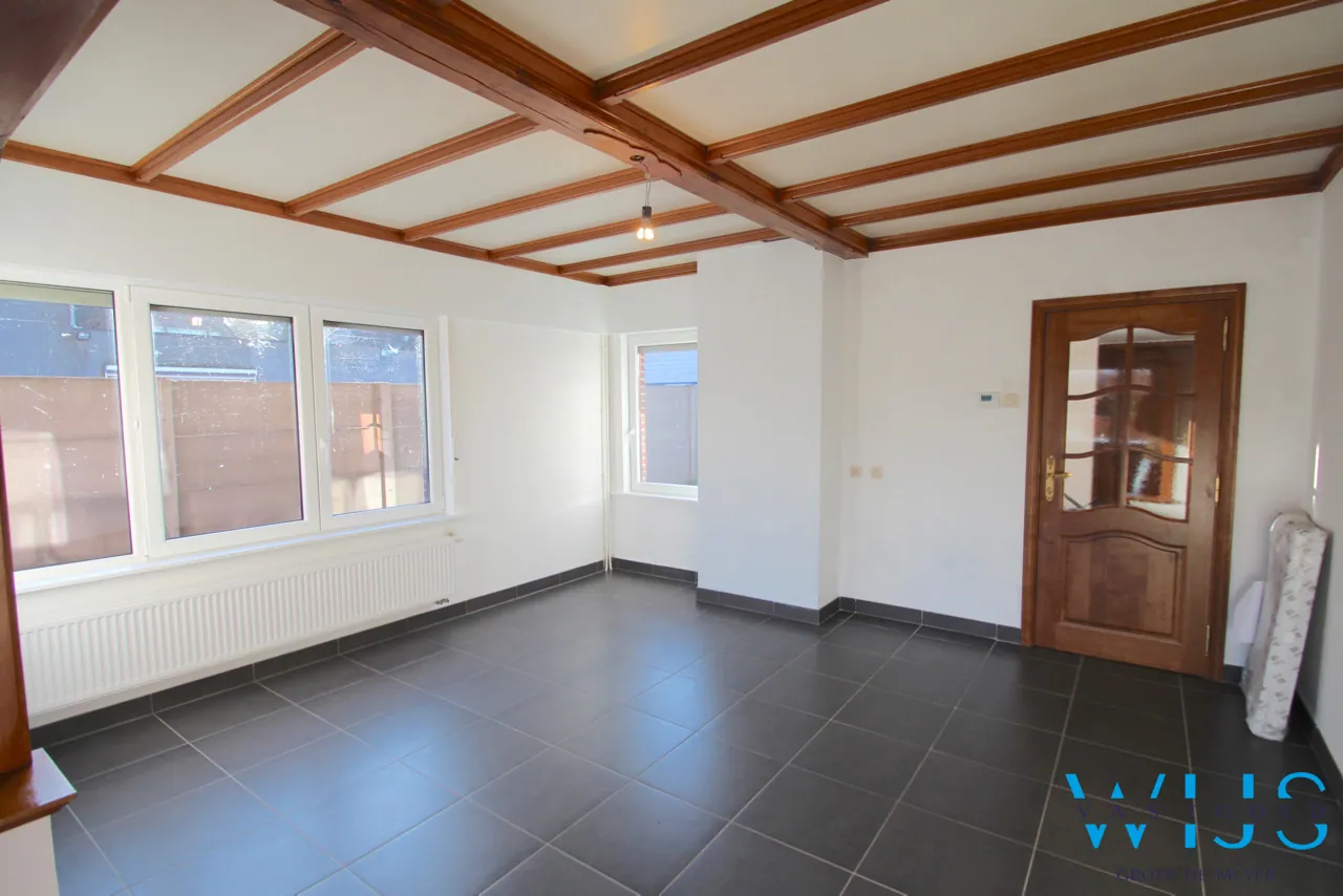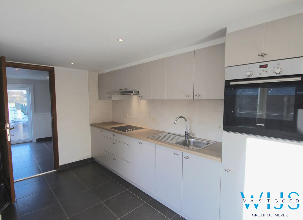 Indeling: Inkom, leefruimte uit 2 delen met veel lichtinval, knusse nieuwe keuken met toestellen en droge kelder, apart toilet en de tijdloze badkamer + wasplaats.