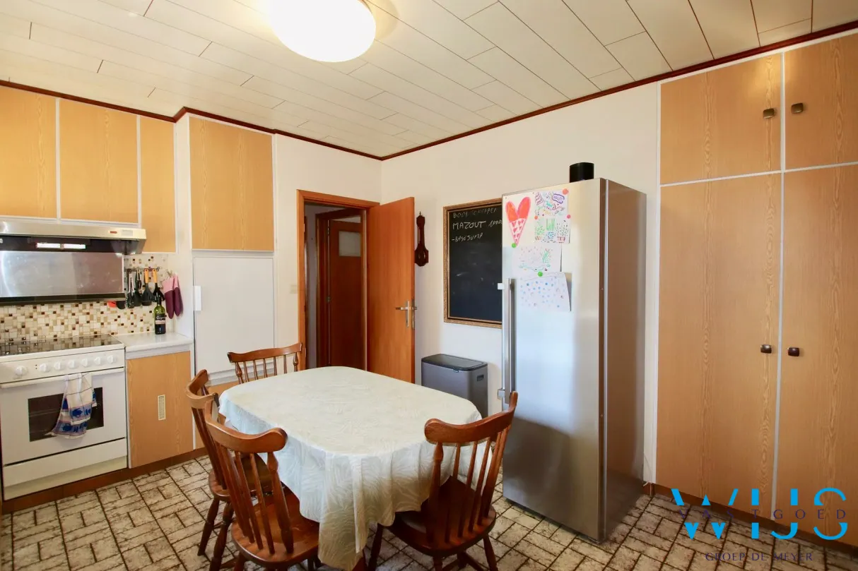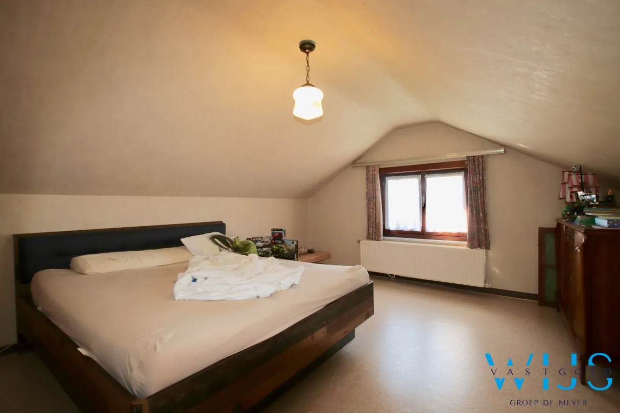 Indeling: Inkom met apart toilet, toffe lichtrijke leefruimte met houthaard en uitzicht over de tuin, ... aparte keukenruimte, droge kelder, 2 volwaardige slaapkamers, de badkamer en aparte wasplaats. Op de verdieping (vaste trap) zijn er 2 zolderruimtes en 1 zeer ruime slaapkamer !