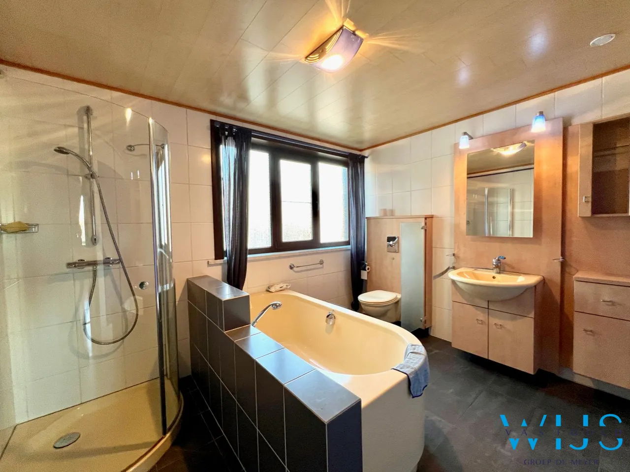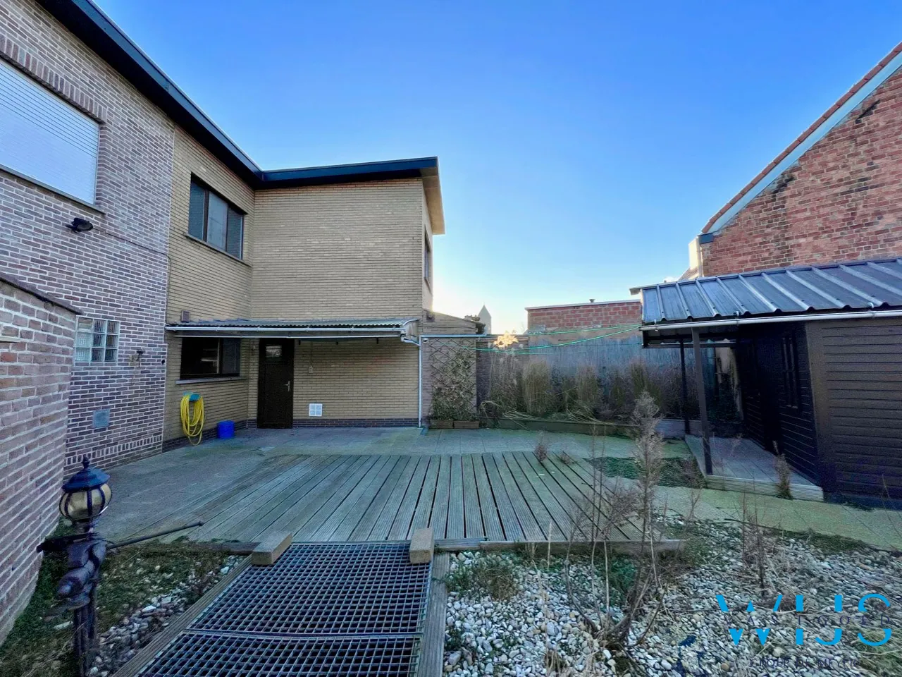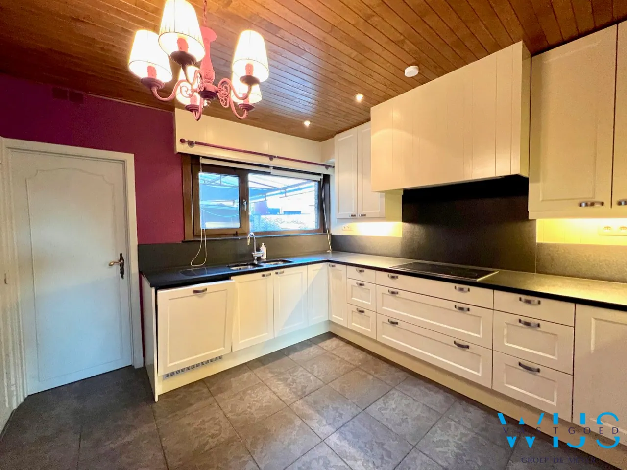 Indeling: inkom met apart toilet, ruime leefruimte met houthaard en rolluiken, zeer mooie maatkeuken incl. toestellen, was -en stookplaats, inpandige garage met berging.