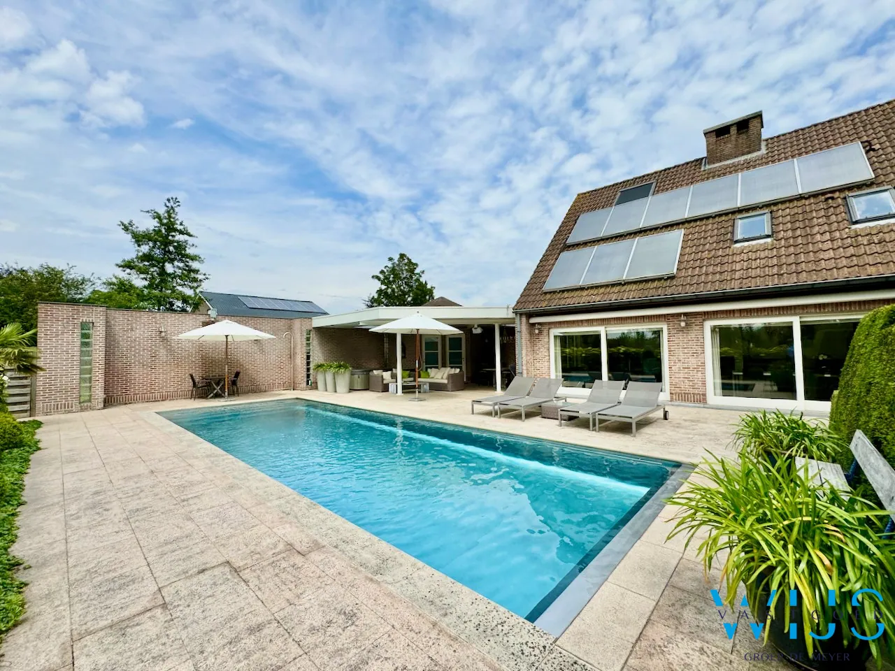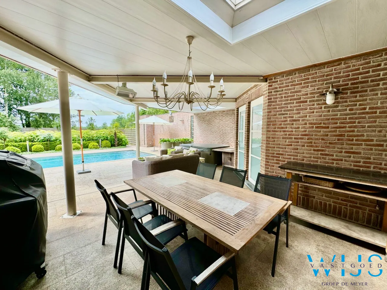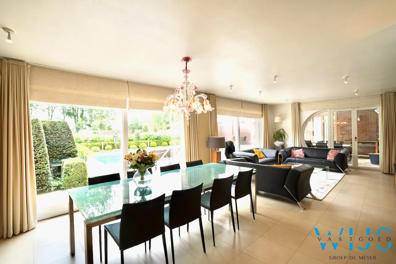 405m² bewoonbare oppervlakte op een schitterend vierkant perceel van 1930 m². Ruime mogelijkheden voor thuispraktijk of bijberoep. In deze eigendom werd niets aan het toeval overgelaten en heeft u alle ruimte en luxe ! Zo zijn 6 slaapkamers (1 studio beneden), 2 recente prachtige badkamers, riante leefruimtes met geweldige lichtinval en zicht op de perfecte tuin met een INOX zwembad van 12x4; totaal geïnstalleerd en van de beste makelij. Hier kan u meerdere maanden buiten leven mede door het overdekt terras en de zonneluifels ! Als troef is er zelfs plaats om 5 wagens binnen te plaatsen ! Ongezien !