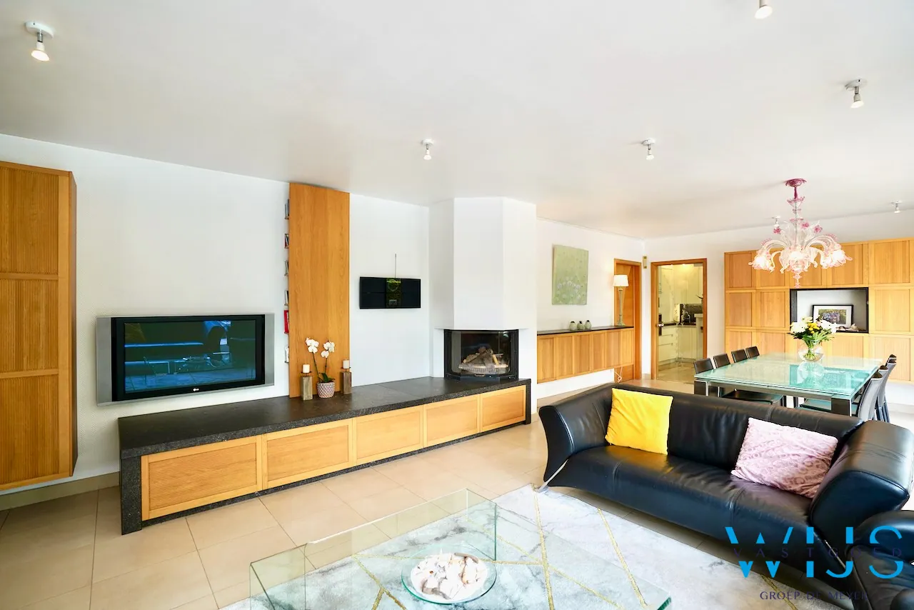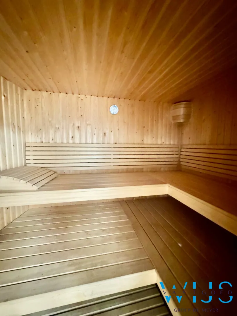 Indeling: inkom met vestiaire, apart toilet, dubbele riante leefruimte, leefkeuken met eetplaats, ruime berging met wasplaats, nachthal, Studio beneden met sauna, kelder doorgang naar dubbele inpandige garages.