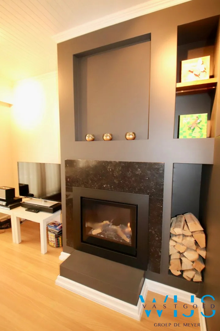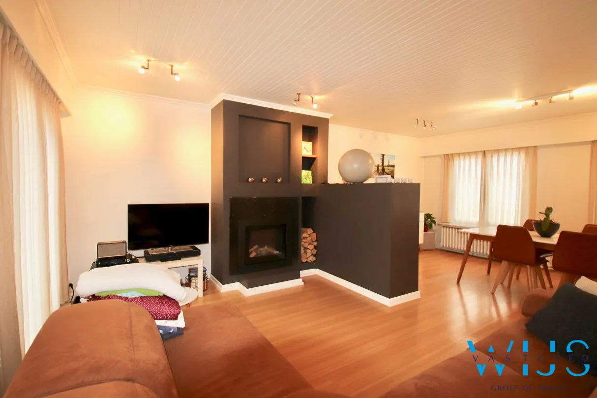 Binnenin biedt de woning een ruime indeling en aangenaam wooncomfort. Hoewel de woning licht op te frissen is, vormt dit net een mooie opportuniteit om ze volledig naar eigen smaak en stijl in te richten. Zo beschikt u over een royale dubbele leefruimte met een sfeervolle gashaard en drie volwaardige slaapkamers.