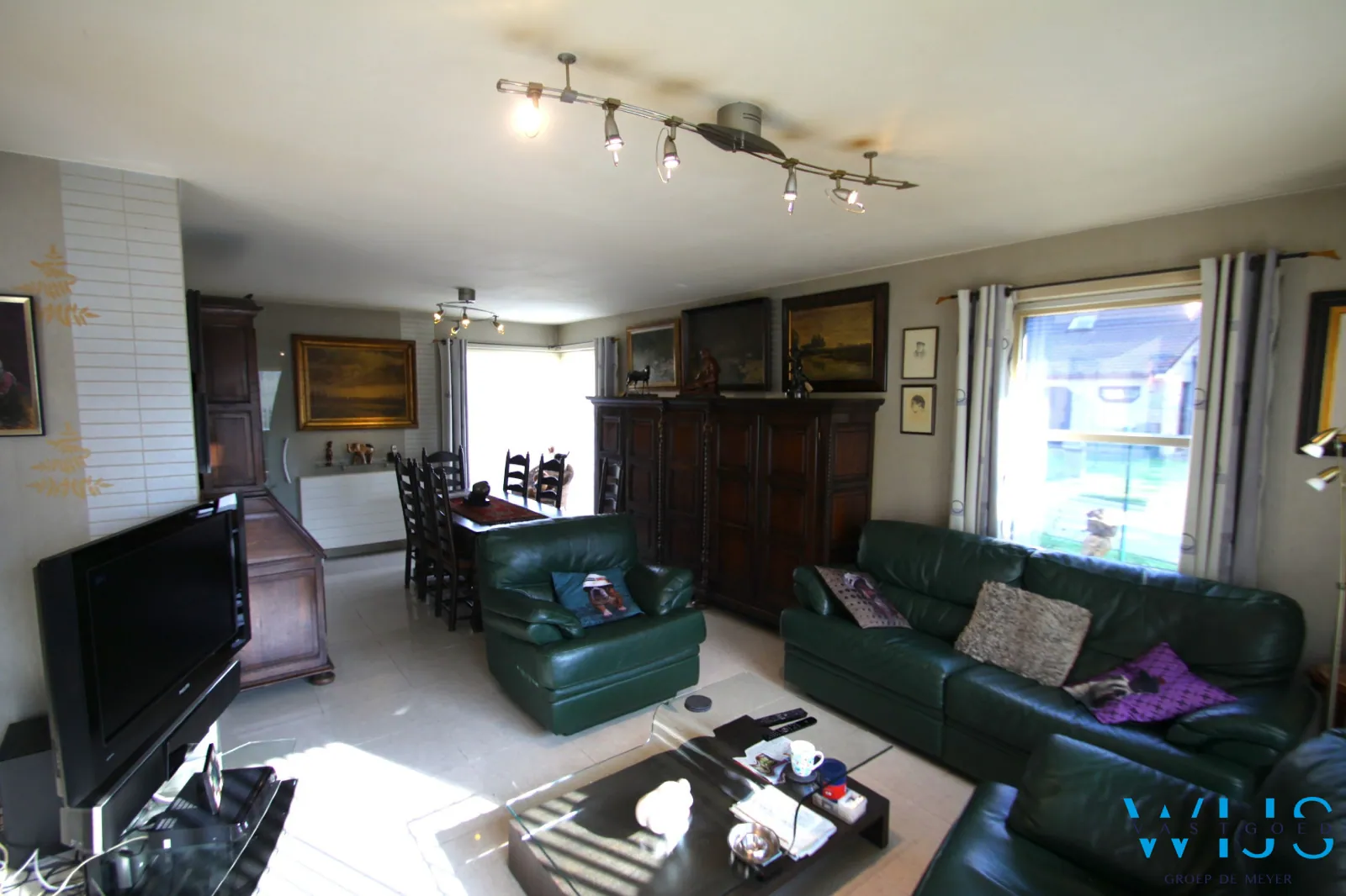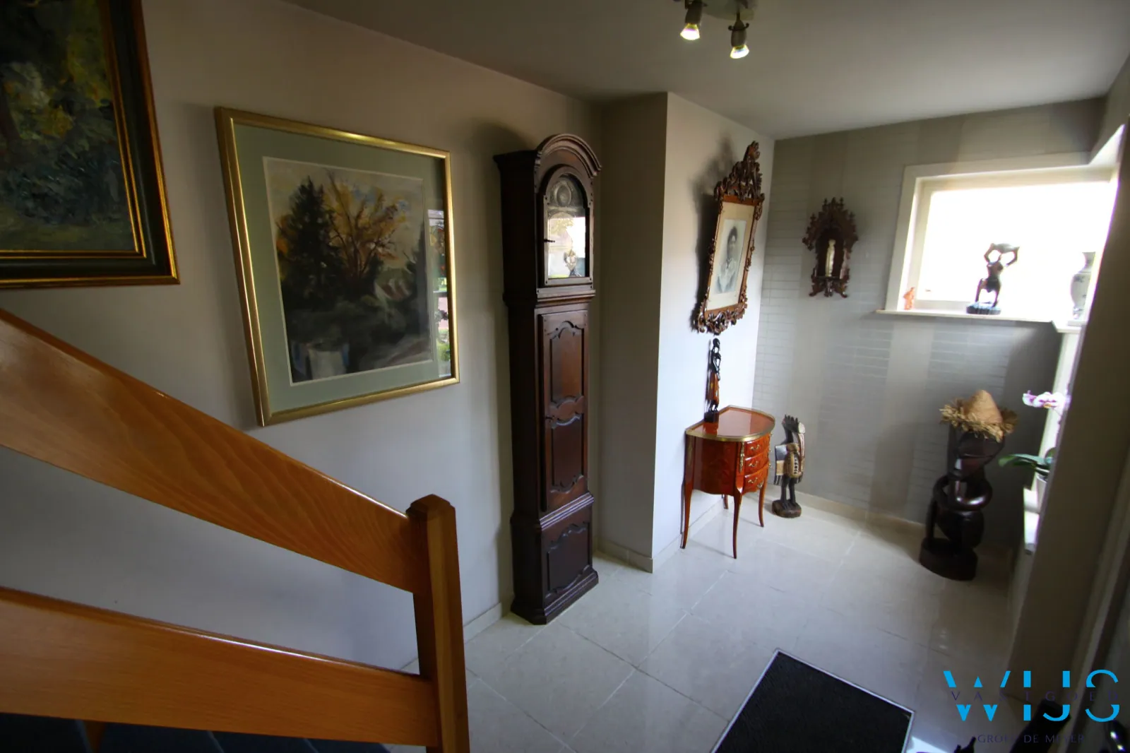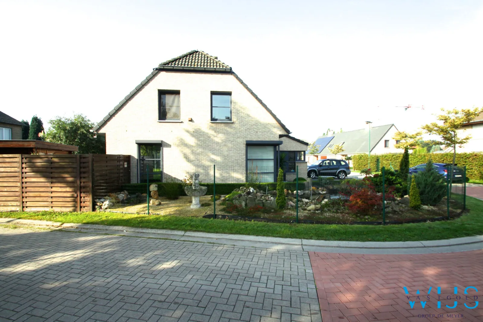 Beneden is er een ruime inkomhal met apart toilet, een L vormige living met open keuken, mooie garage + berging en aan de keuken heeft u een ruim terras waar u in alle rust kan genieten van de zon. In de groene voortuin is er nog een vijver en een oprit voor 2 wagens!