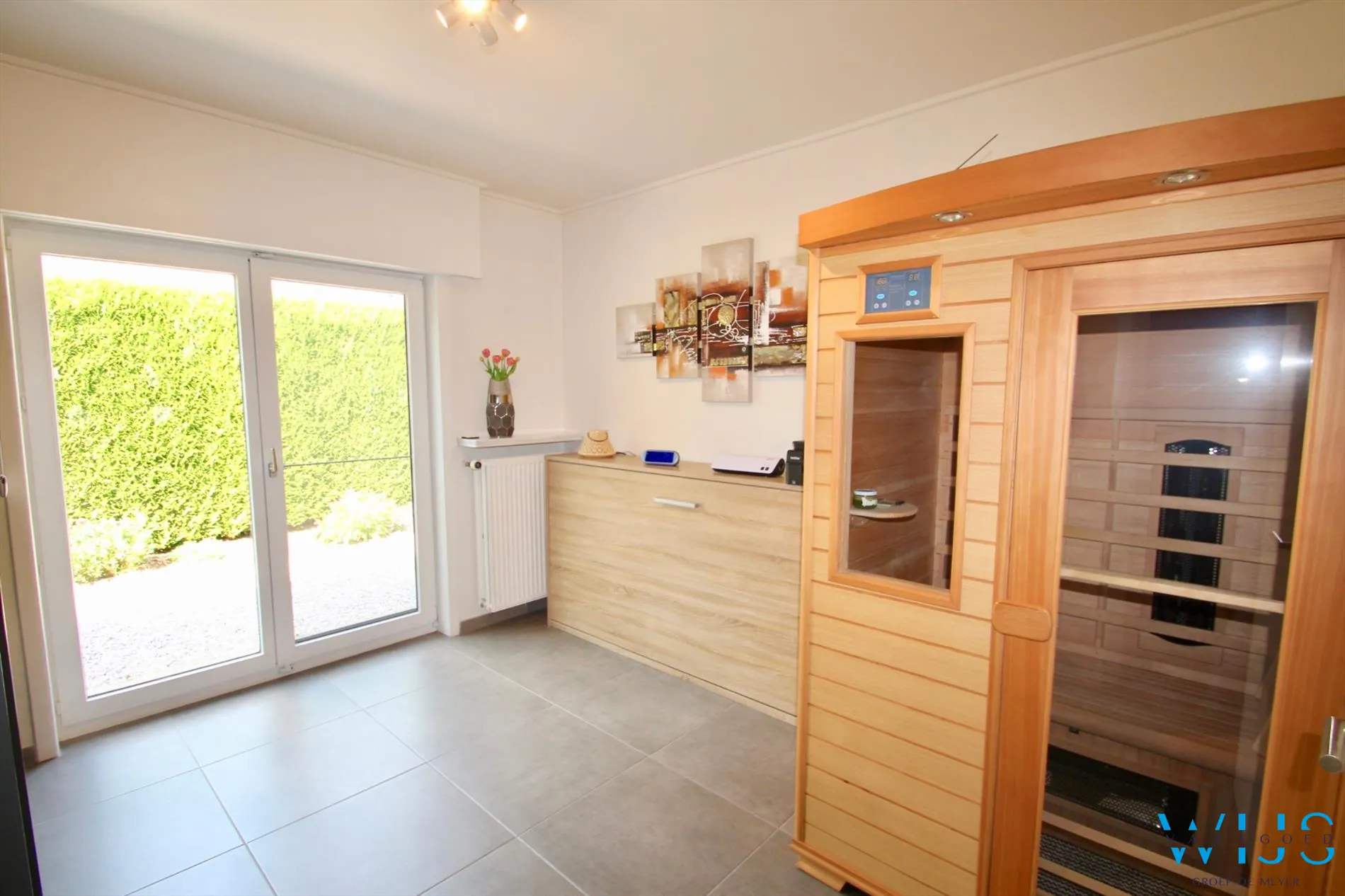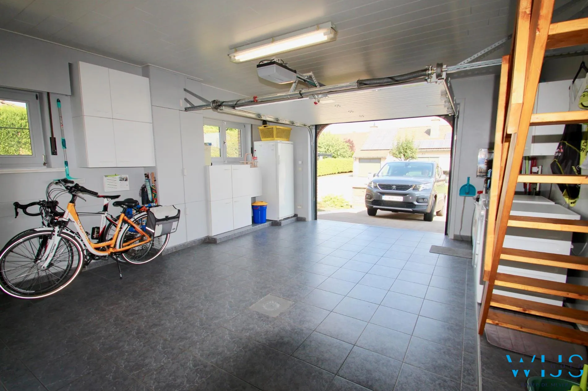 Indeling: Mooie inkom met ... toilet, via de glazen deur komen we in de ultra fris afgewerkte leefruimte met veel lichtinval, de mooie keuken met toestellen, berging, 2 slaapkamers beneden met daartussen de tijdloze vernieuwde badkamer en de toch wel ruime garage met wasplaats. Via de trap gaan we naar de 2 de verdieping die u nog zelf kunt invullen !