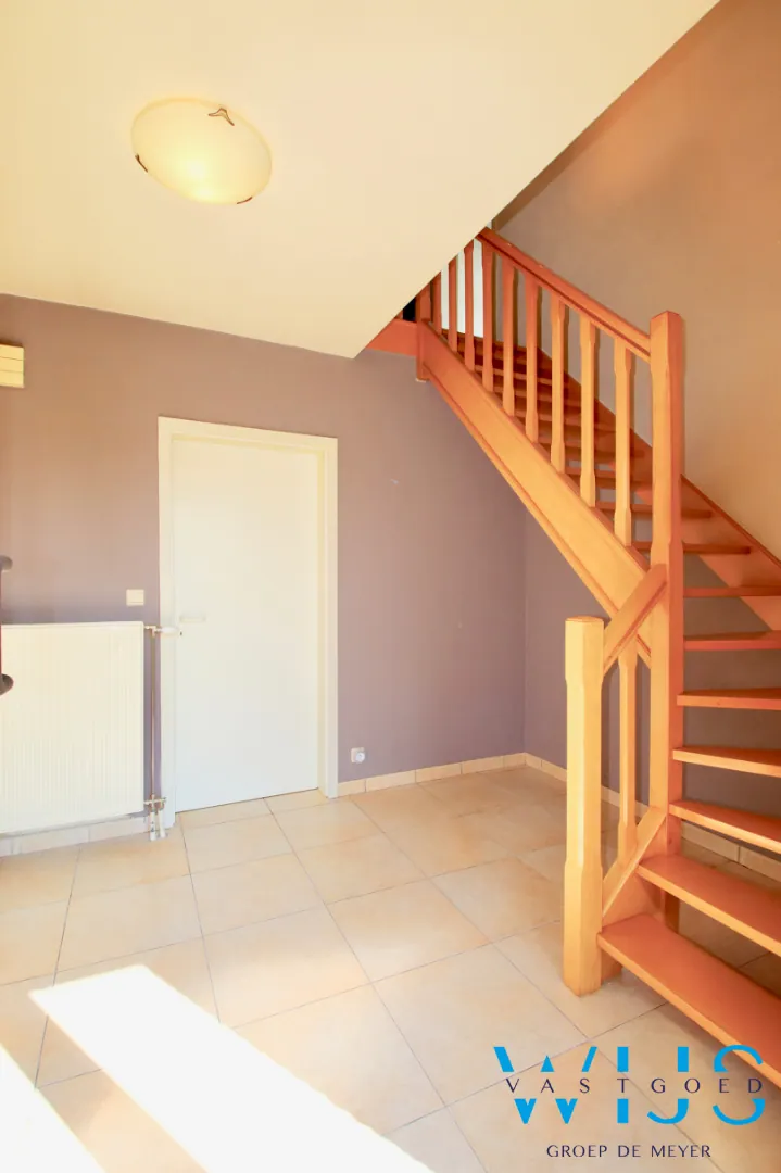 Indeling: Inkom met apart toilet, ruime leefruimte, geïnstalleerde keuken, inpandige garage met wasplaats. Op de verdieping zijn er de 3 slaapkamers en de badkamer met bad/douche en 2de toilet. De zolder is bergruimte.