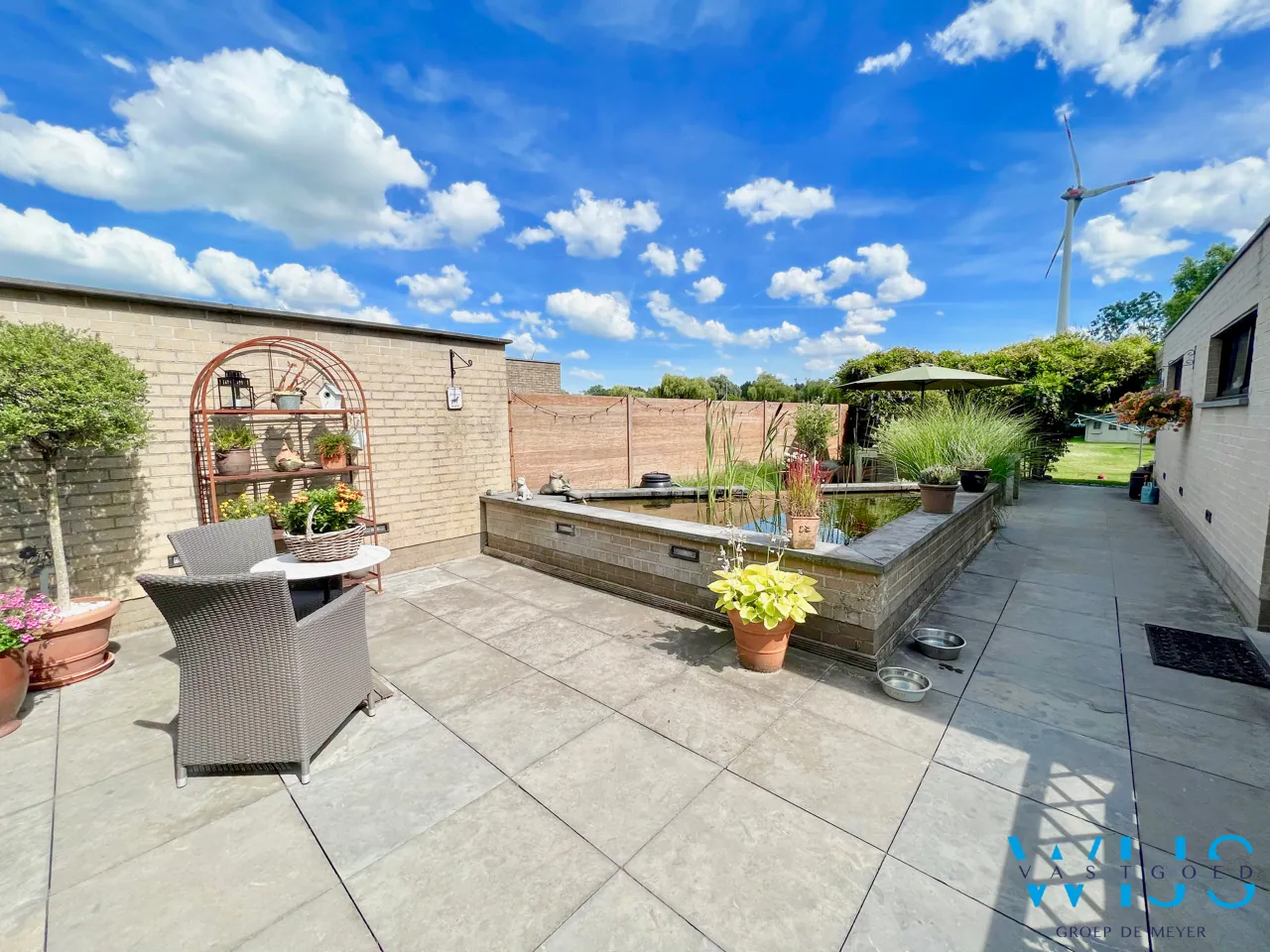 De tuin is volledig voorzien van terrassen, leuke vijver , loungegedeelte en een mooi tuinhuis.