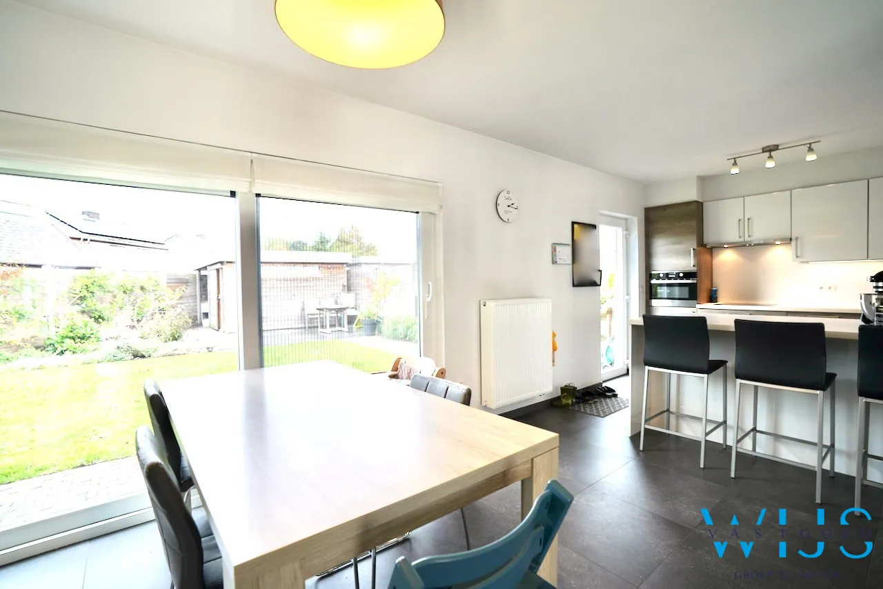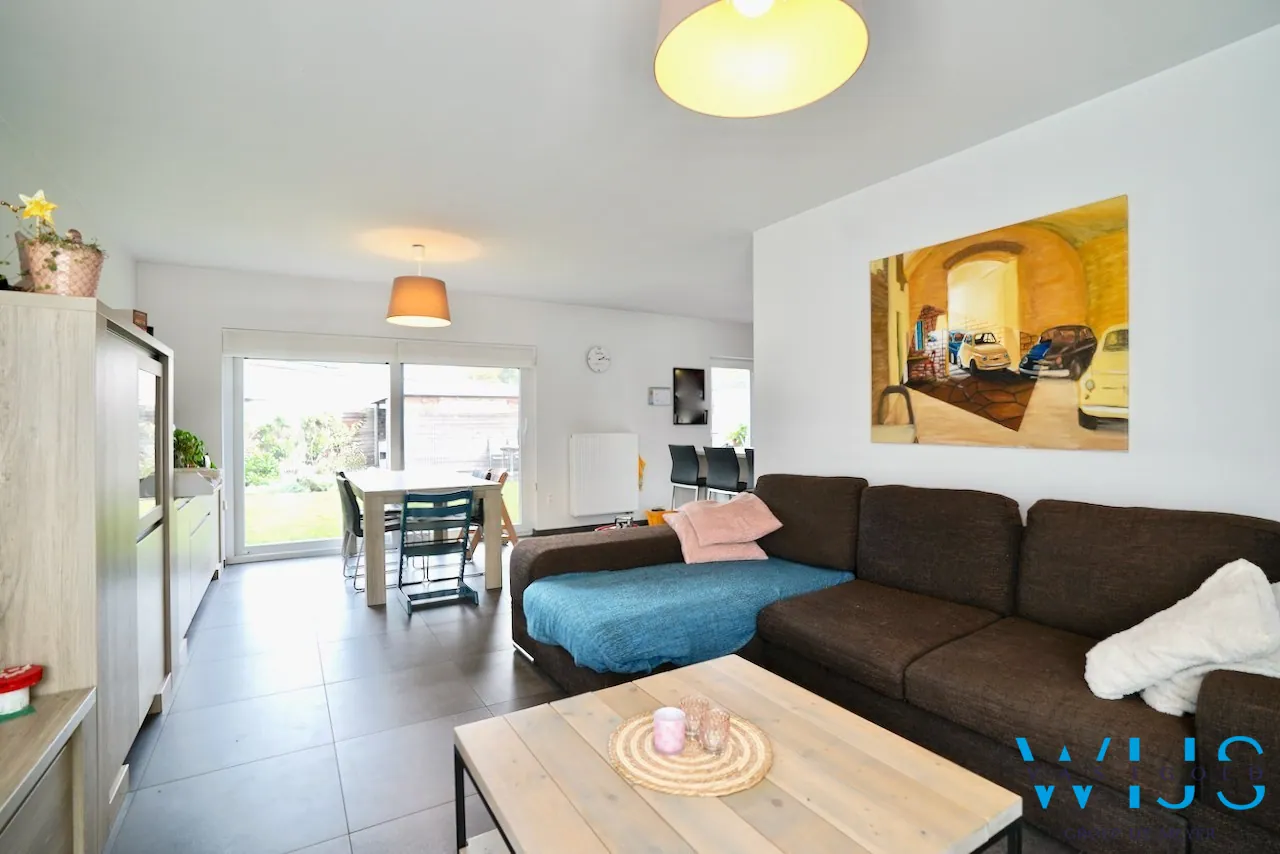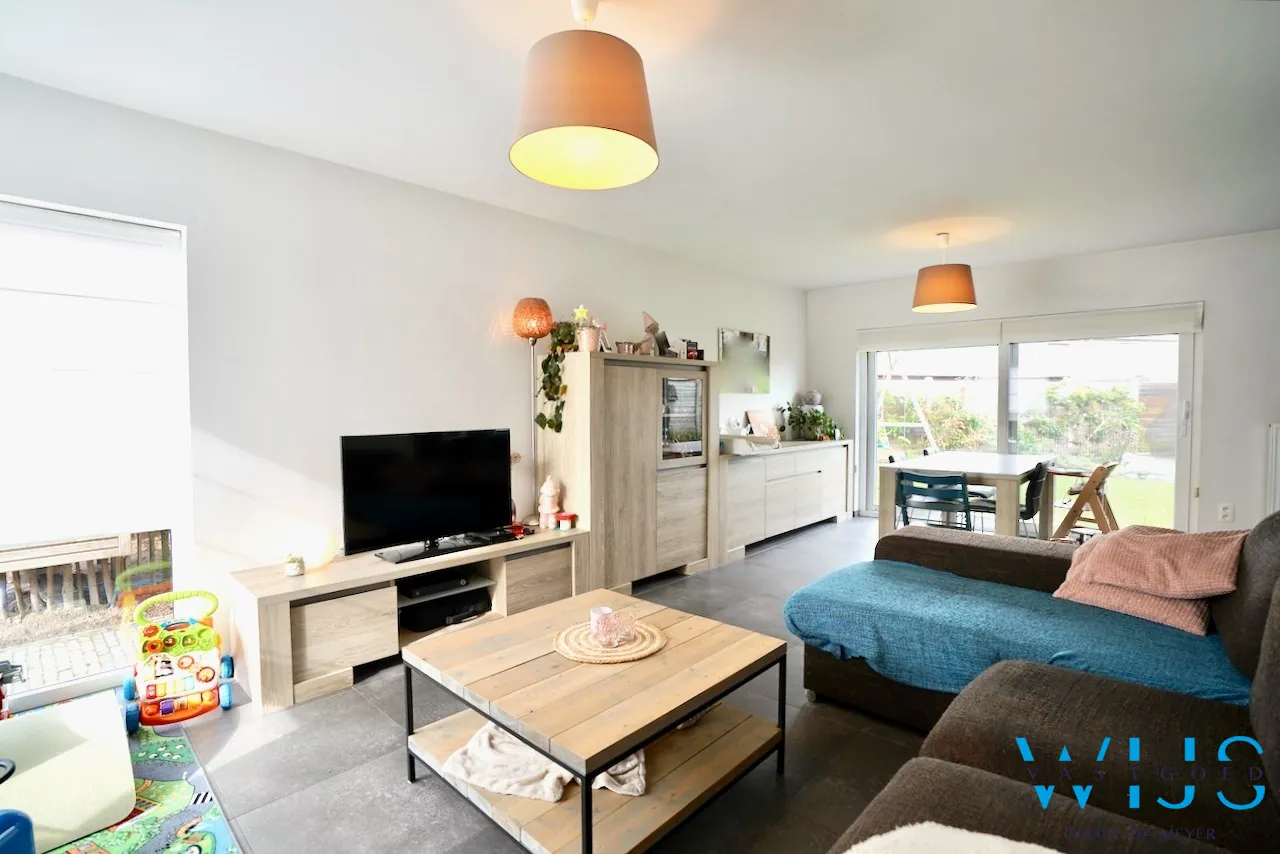 Indeling: inkomhal met vestiaire, apart toilet, leefruimte met eet- en zithoek, open geïnstalleerde keuken, ... berging/wasplaats en de zonnige tuin met tuinberging.