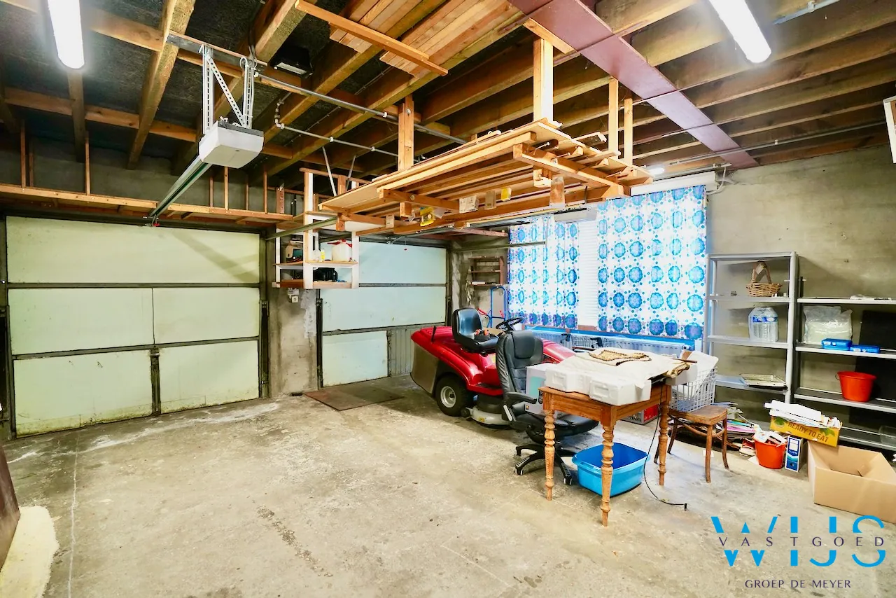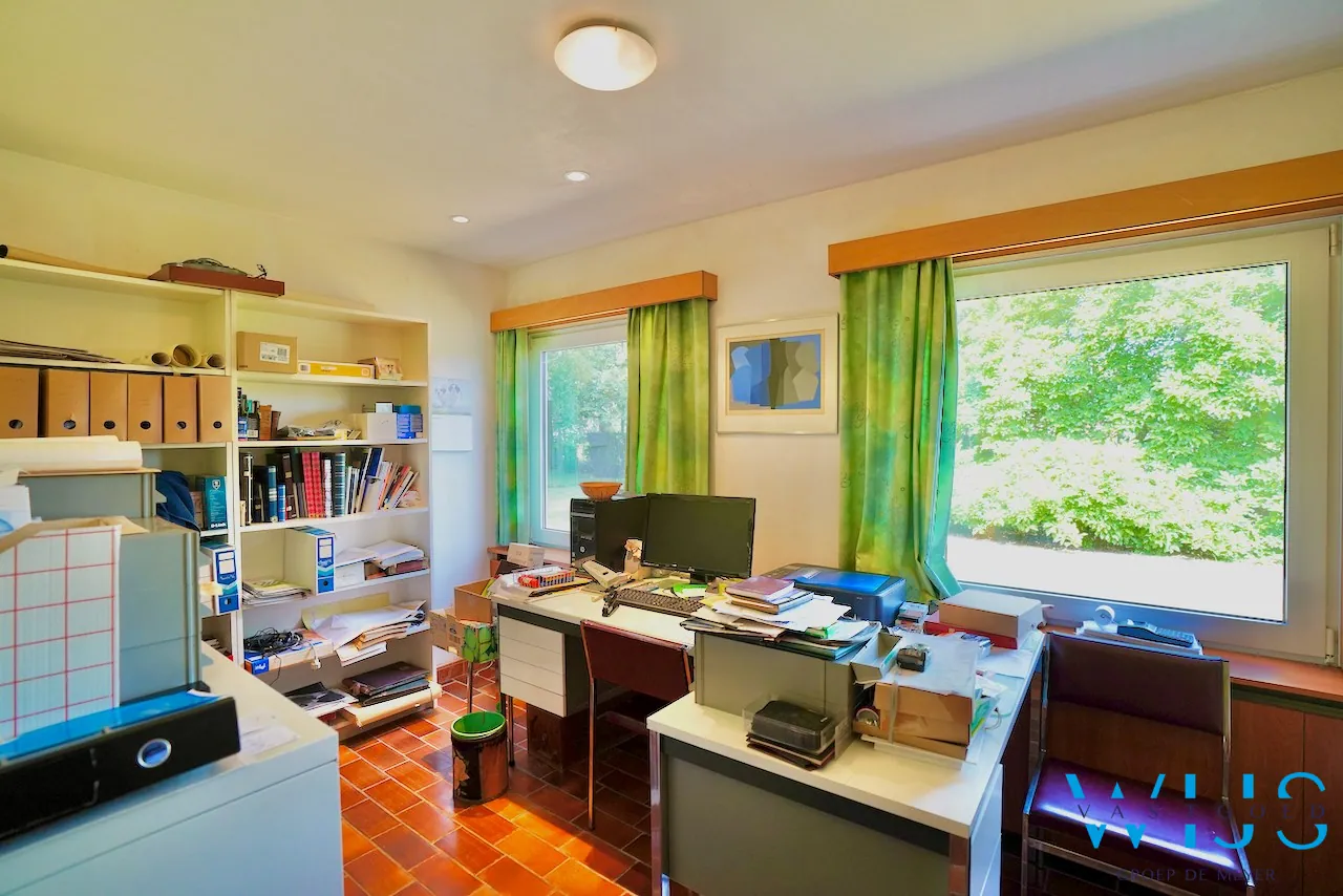 Indeling: inkom, apart toilet, berging met toegang tot de kruipkelder, bureauruimte (slaapkamer 1), leefruimte uit 2 gedeeltes, keuken, nachthal, dubbele inpandige garage, 2 ruime slaapkamers, badkamer met bad en douche, hal naar nieuw gedeelte (studio met bureauruimte/hobbyruimte), overdekte werkplaats en de groene tuin rondom.