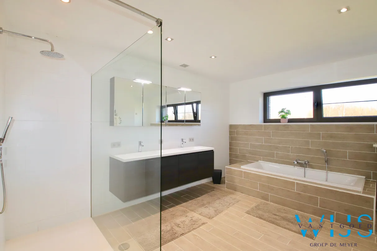 Eerste verdieping: 3 volwaardige slaapkamers, badkamer voorzien van een bad, inloopdouche en dubbele lavabo, toilet, ruime geïsoleerde zolderverdieping met extra mogelijkheden (4de slaapkamer).