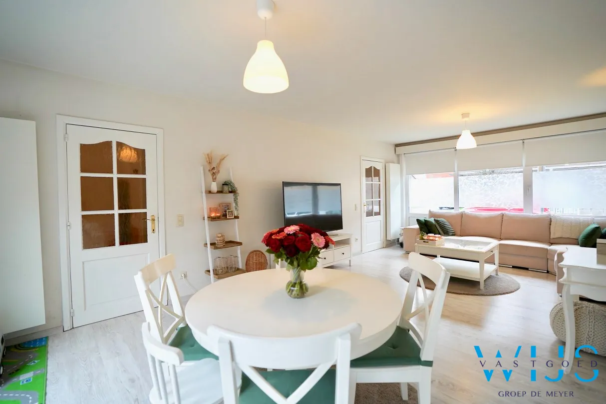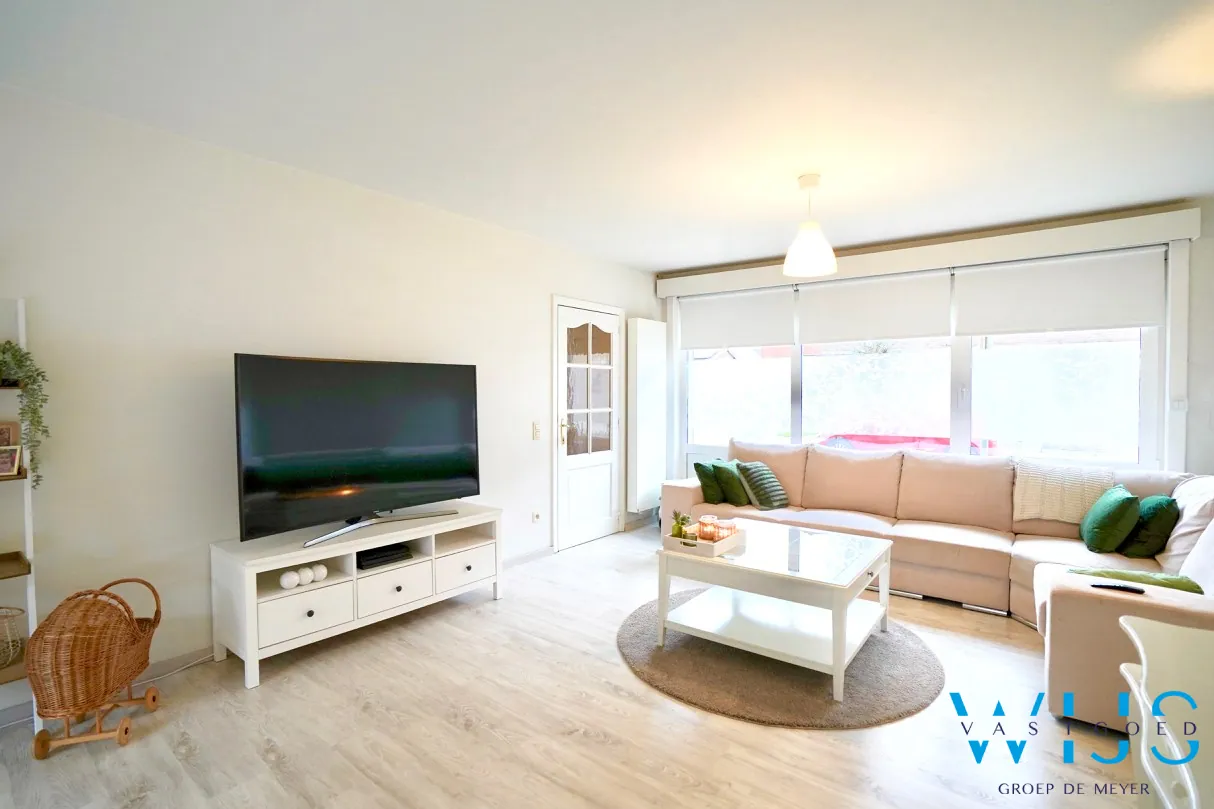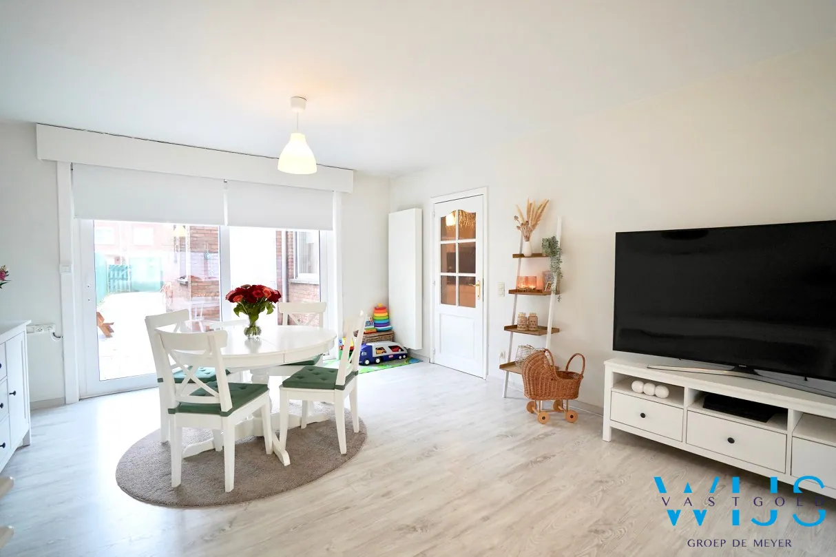 Indeling: ruime inkomhal met vestiaire, lichtrijke gezellige leefruimte, landelijke keuken, hal, apart toilet, berging/wasplaats en de volledig ... onderhoudsvriendelijke tuin met doorgang (te voet of met de fiets).